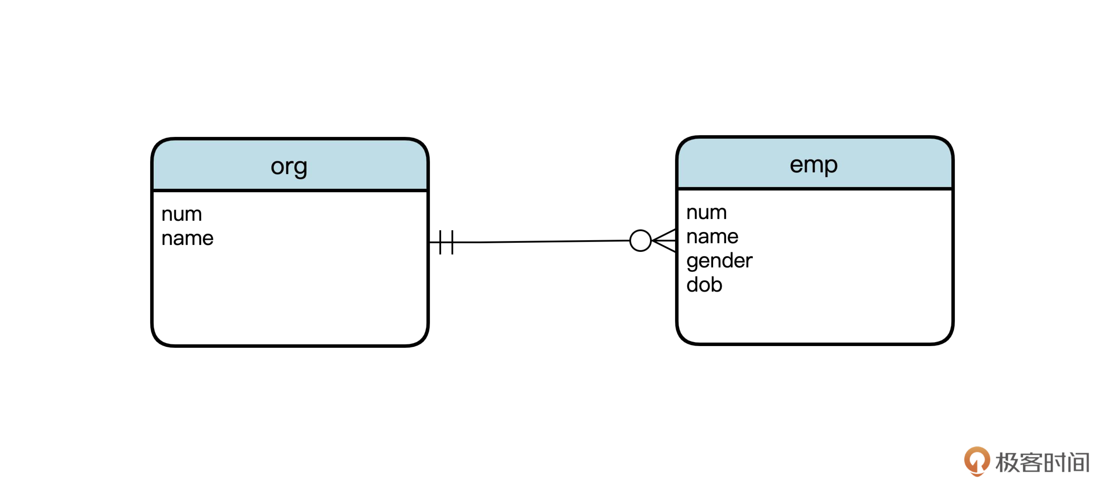 传统的软件工程,是按照“概念设计”“逻辑设计”和“物理设计”的步骤进行数据库设计的。其中概念设计和逻辑设计,通常会采用ER图,也就是实体联系图。ER图同样没有业界统一的标准,有多种画法。下面这张图用了一种常用的画法,表示组织和员工的一对多关系。