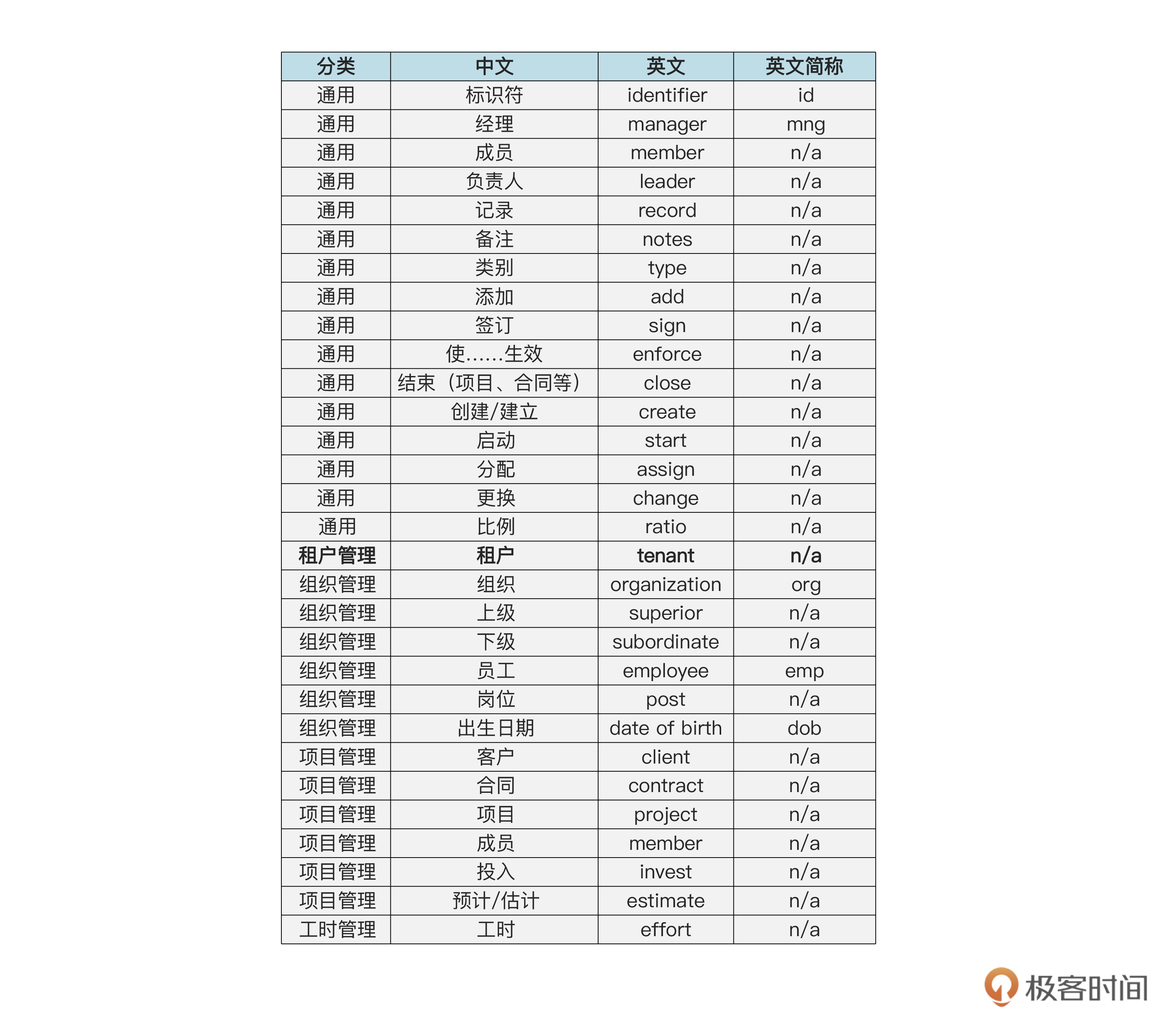 答案就是使用我们前面建的词汇表。在词汇表里,我们规定了每个中文词汇对应的英文全称和简称。在为数据库表以及字段等命名时,如果词汇表中有简称就用简称,否则就用全称。我们把词汇表在这里再列一遍作为参考。