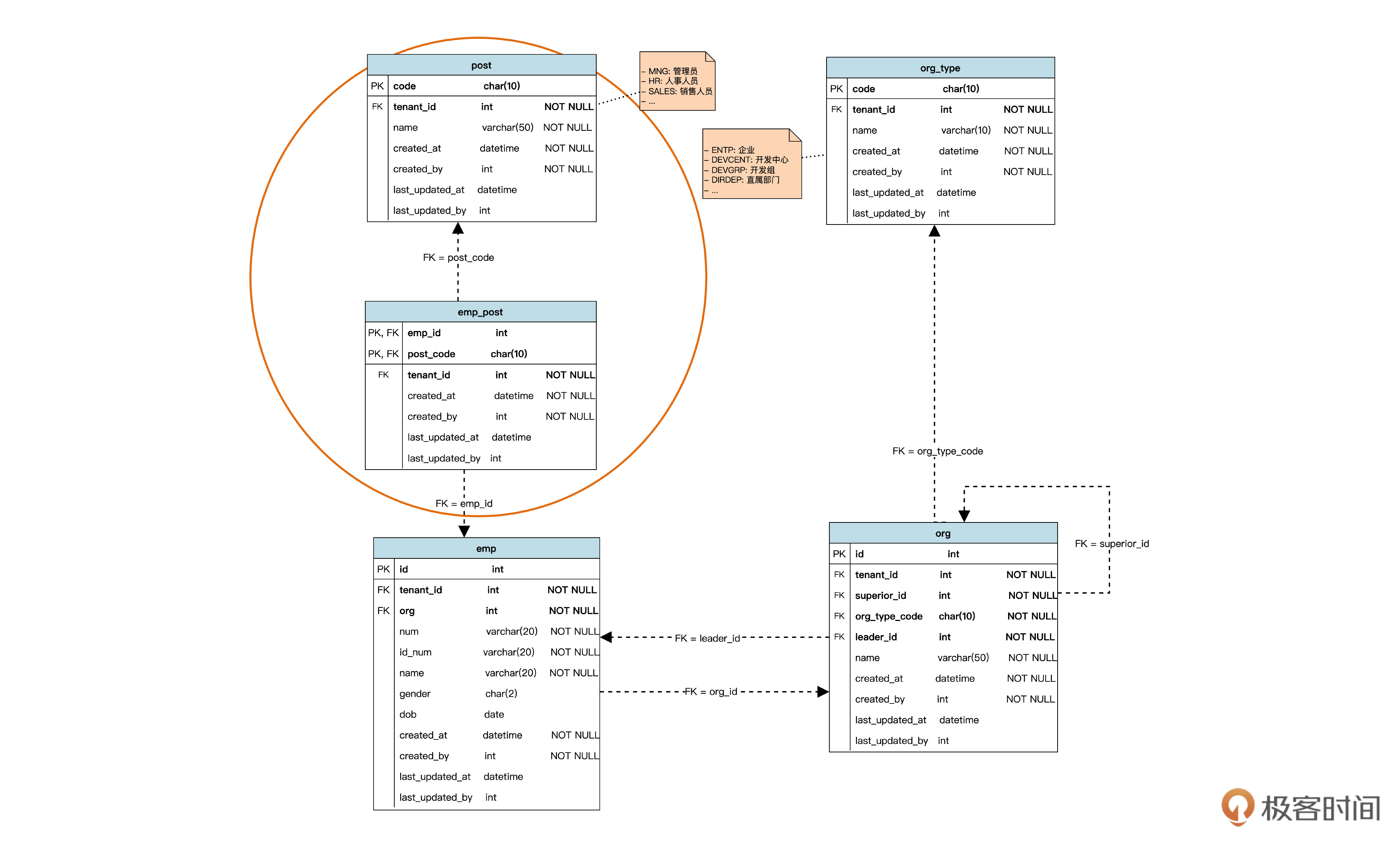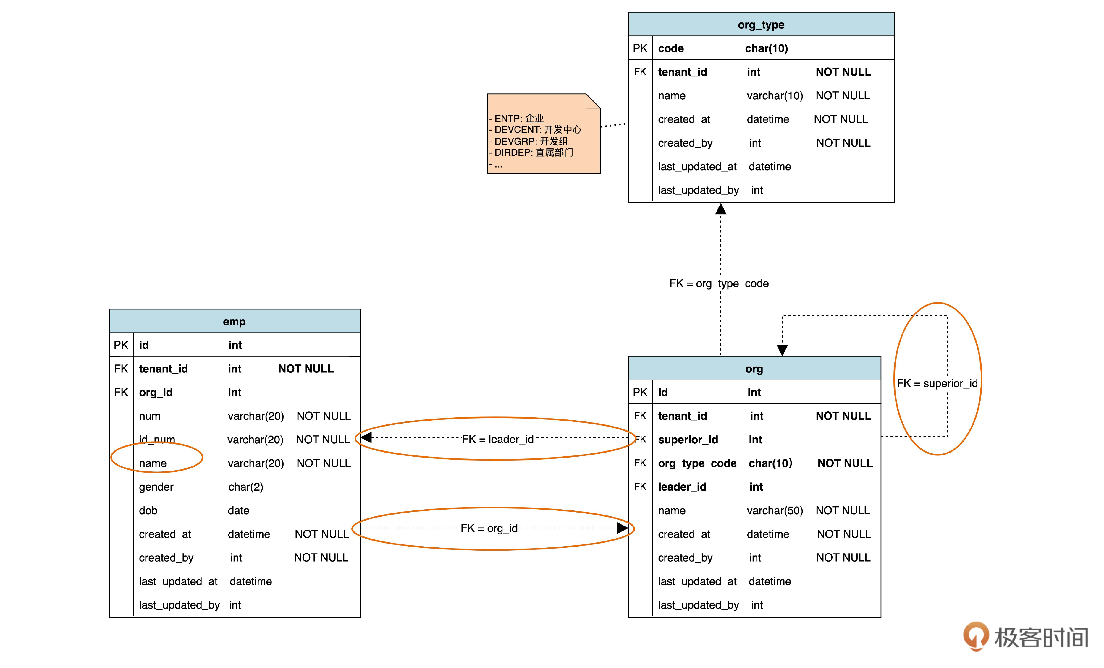先看图中的实线箭头,这个箭头代表外键参照关系。按照领域模型,租户和组织是一对多关联。一个一对多关联,在数据库设计时可以映射成一个外键。