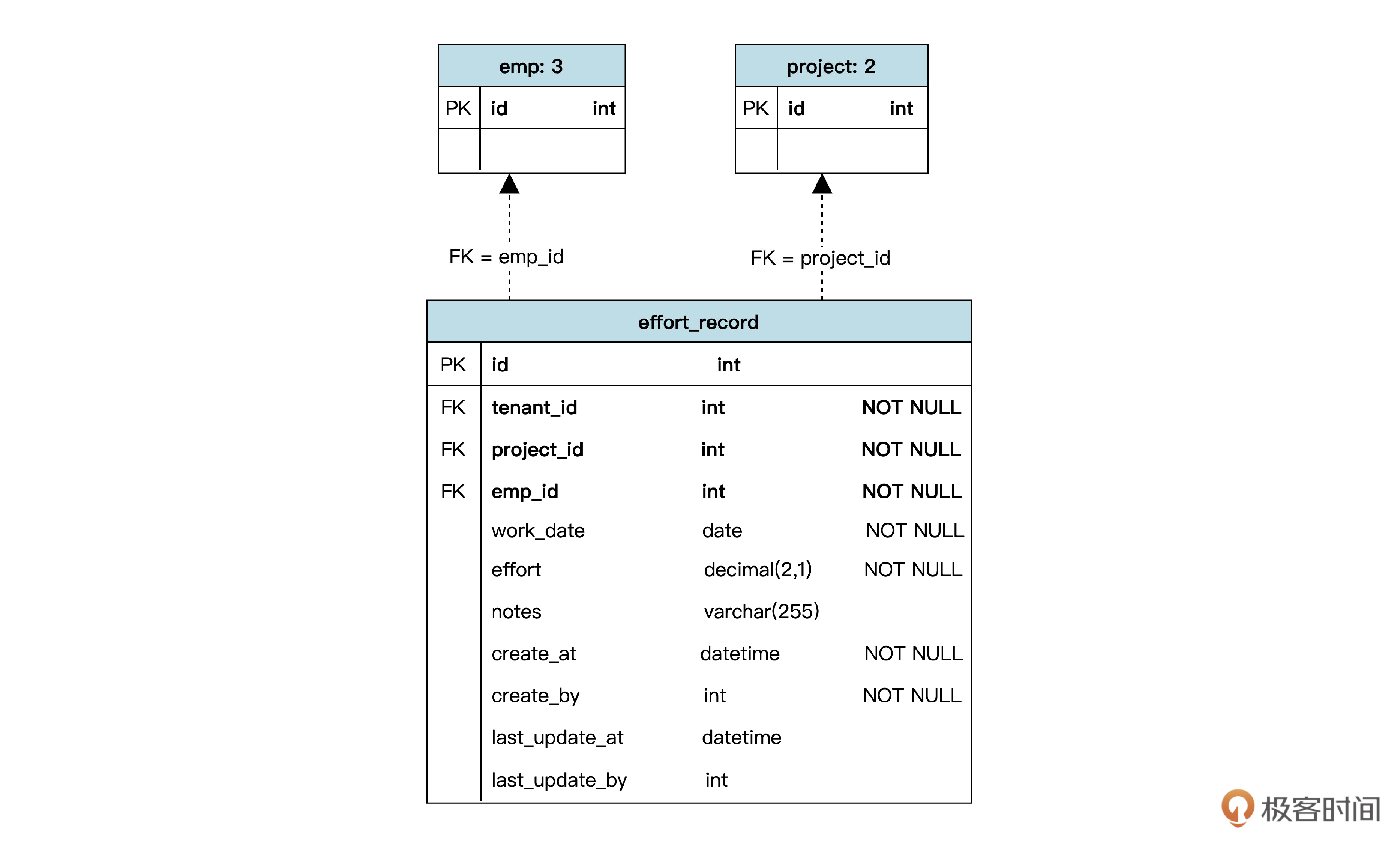 这其实是一种绘图技巧。为了避免整张图像蜘蛛网一样凌乱,我们不打算把所有表都画在同一张图上,而是每个模块画一张。而 emp 表在组织管理中出现过一次,在项目管理中又出现了,所以我们用了 emp: 2 说明这是 emp 表的第 “2” 次出现。