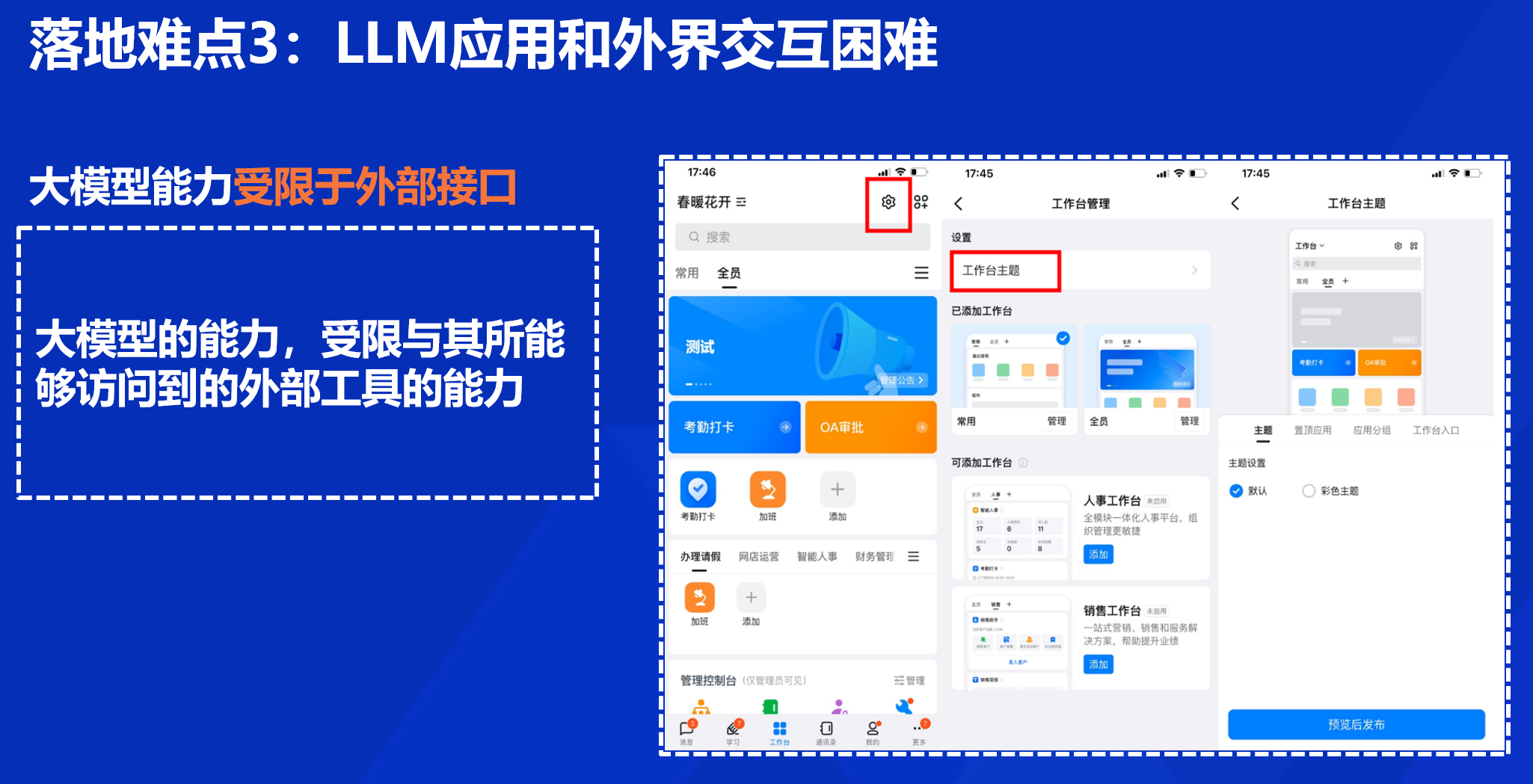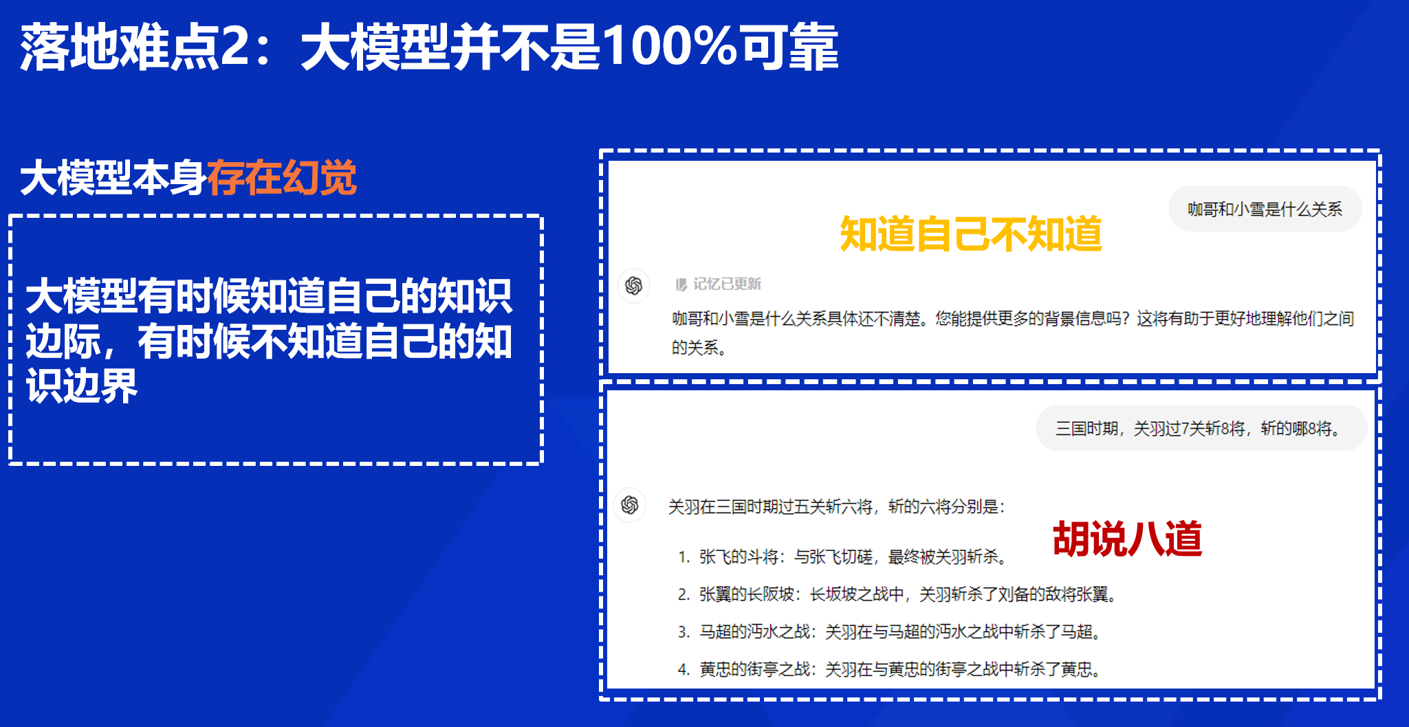 第二个难点在于,尽管 LLM 在很多任务上表现优异,但它并非完全可靠。LLM 有时会生成看似合理但实际上并不准确的信息;LLM 有时候并不清楚自己知识的边界,可能会自信地给出错误答案。相同的输入可能会得到不同的输出,缺乏稳定性。而且,LLM 的知识往往有时间截止点,无法实时更新。