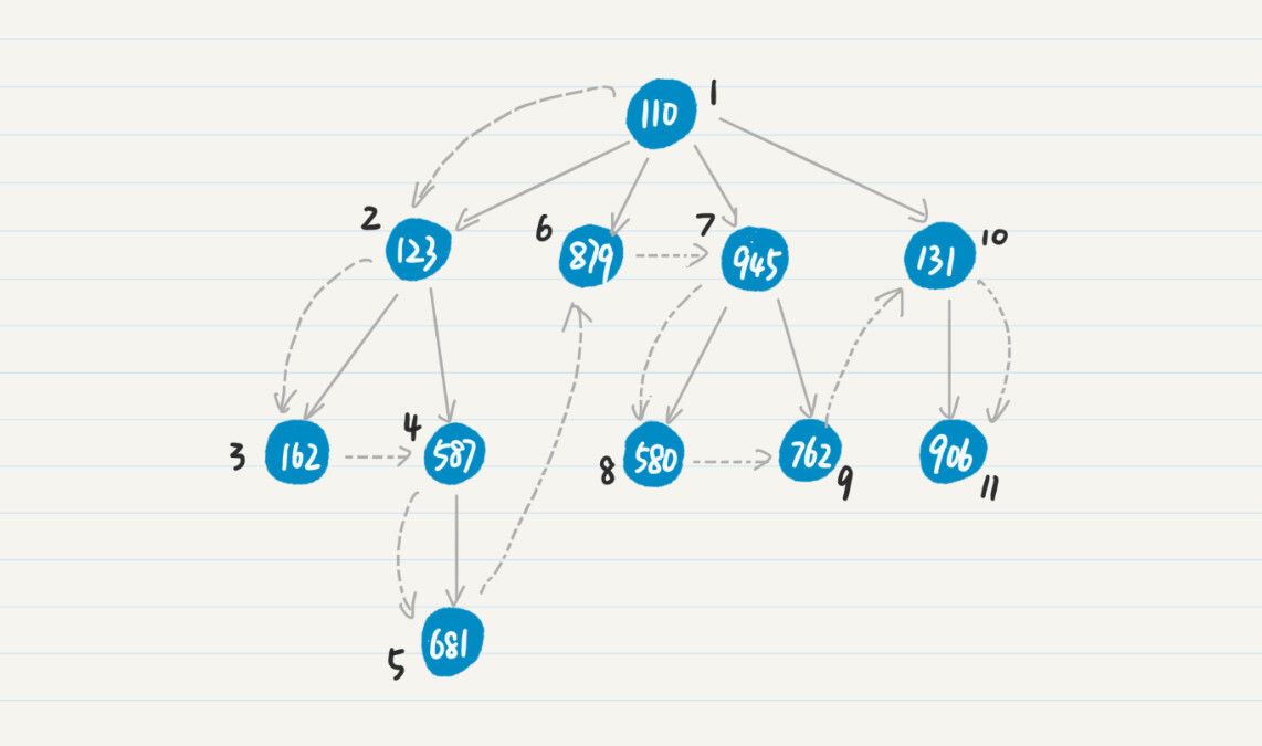 第5步,处理结点162,由于162是叶子结点,所以没有发现新的点。第6步,重复第2和第3步,处理结点587,将新发现结点681压入栈中。