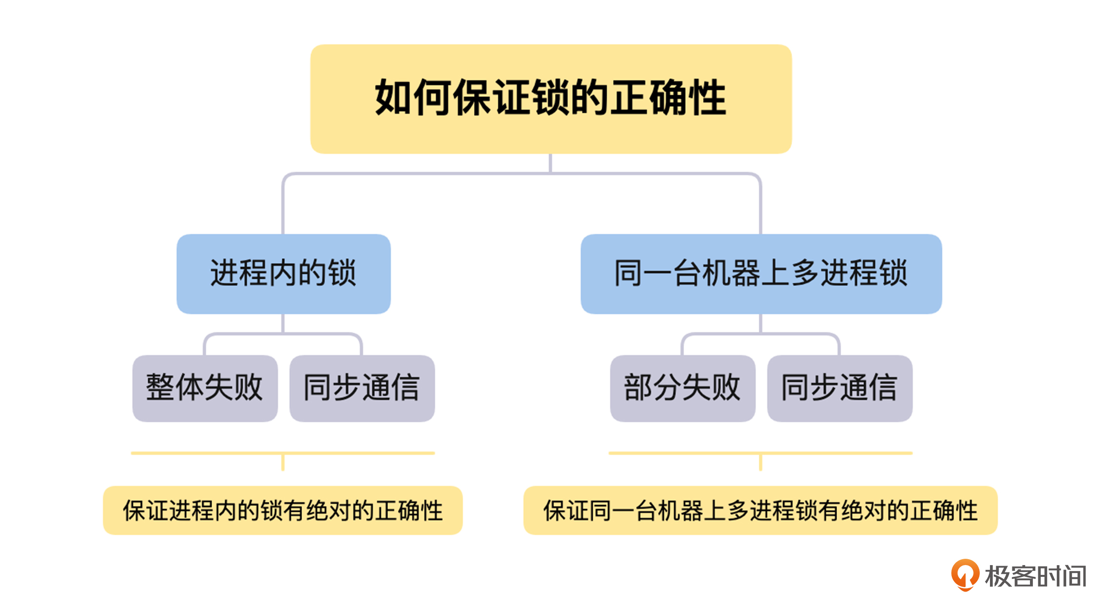 另一个方面,进程内锁的解锁操作是进程内部的函数调用,这个过程是同步的。不论是硬件或者其他方面的原因,只要发起解锁操作就一定会成功,如果出现失败的情况,整个进程或者机器都会挂掉。所以,因为整体失败和同步通信这两点,我们可以保证进程内的锁有绝对的正确性。