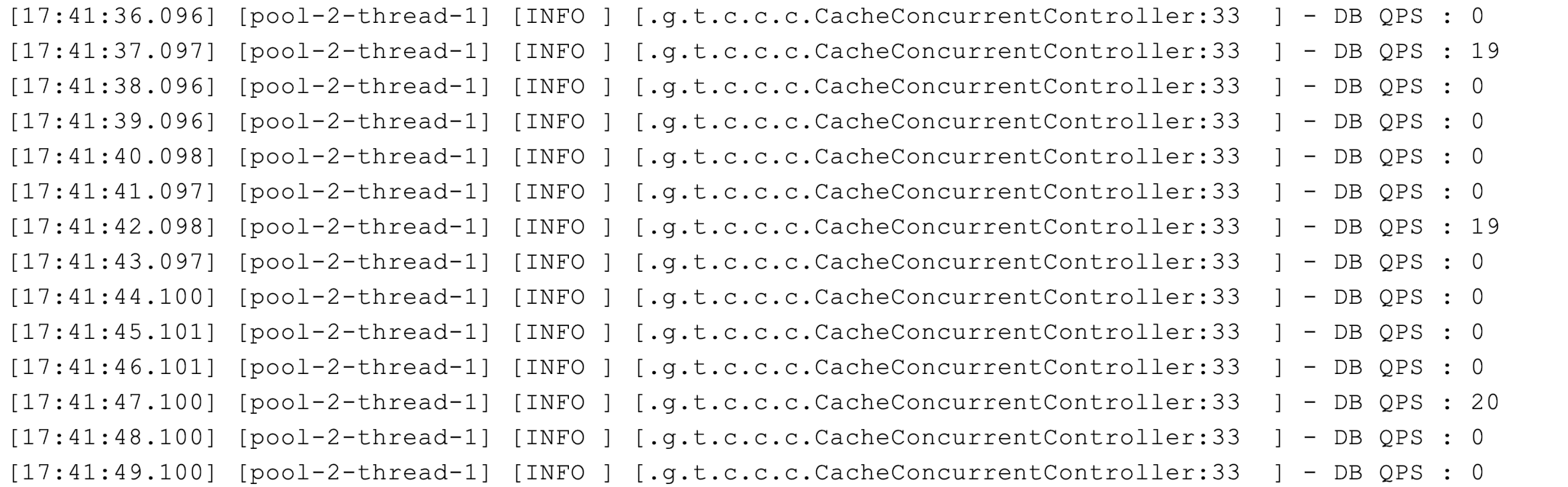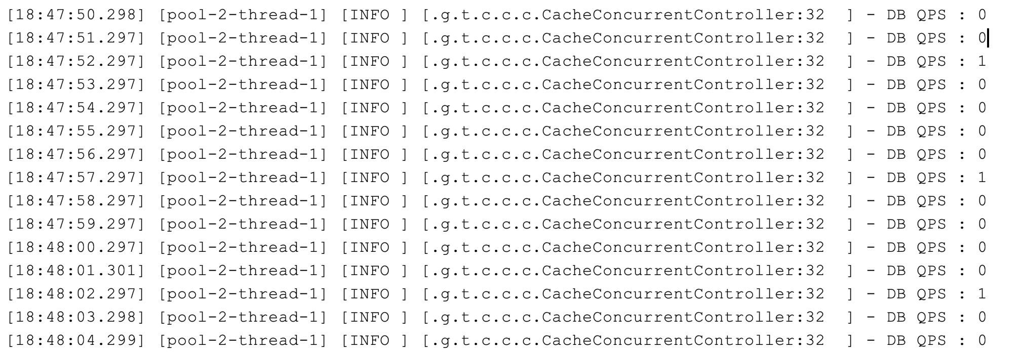 我们来重现下这个问题。在程序启动的时候,初始化一个热点数据到Redis中,过期时间设置为5秒,每隔1秒输出一下回源的QPS: