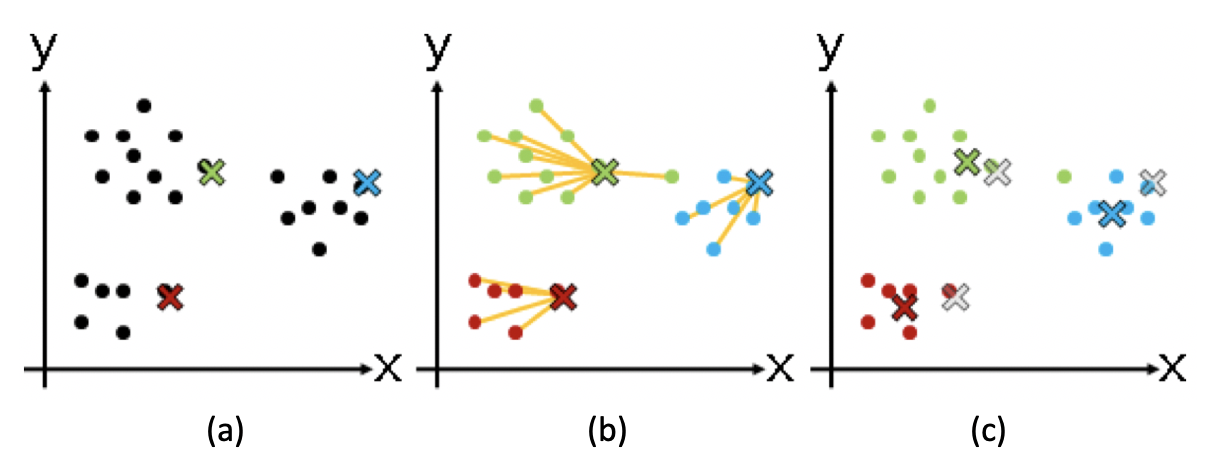 在这张图中,( a )、( b )、( c )三步分别展示了质心和群组逐步调整的过程。我们一一来看。(a)步骤是选择初始质心,质心用不同颜色的x表示;( b )步骤开始进行聚类,把点分配到最近的质心所在的组;( c )步骤重新计算每个群组的质心,你会发现x的位置发生了改变。之后就是如此重复,进入下一轮聚类。
