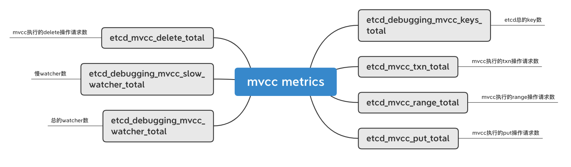 正如我在[14]和[15]里和你介绍延时、内存时所提及的,etcd提供了丰富的metrics来展示整个集群的核心指标、健康度。metrics按模块可划分为磁盘、网络、MVCC事务、gRPC RPC、etcdserver。