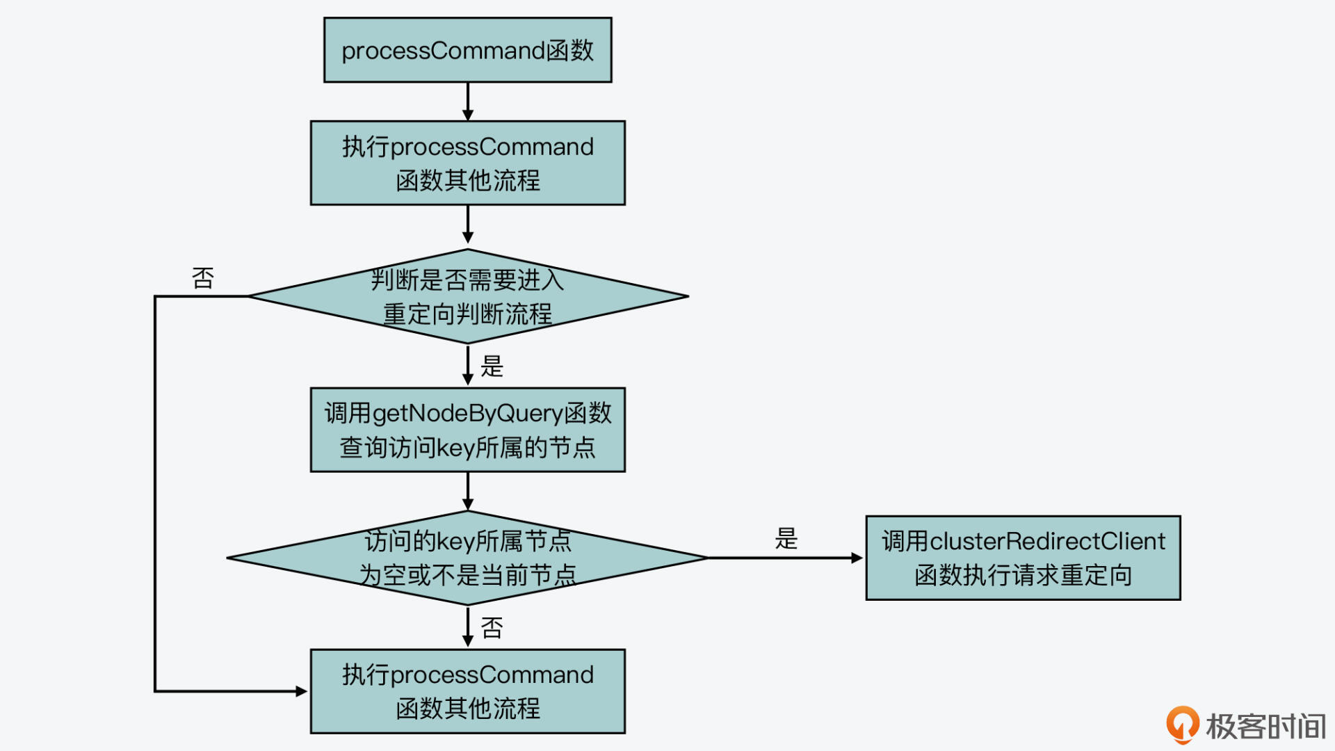 不过你要知道的是,Redis Cluster会因为负载均衡或节点故障等原因而执行数据迁移,而这就会导致客户端访问的key并不在接收到命令的集群节点上。因此,集群节点在命令执行函数processCommand中,针对集群模式,就增加了额外的处理逻辑。这主要是包括调用getNodeByQuery函数查询访问的key实际所属的节点,以及根据查询结果调用clusterRedirectClient函数执行请求重定向。