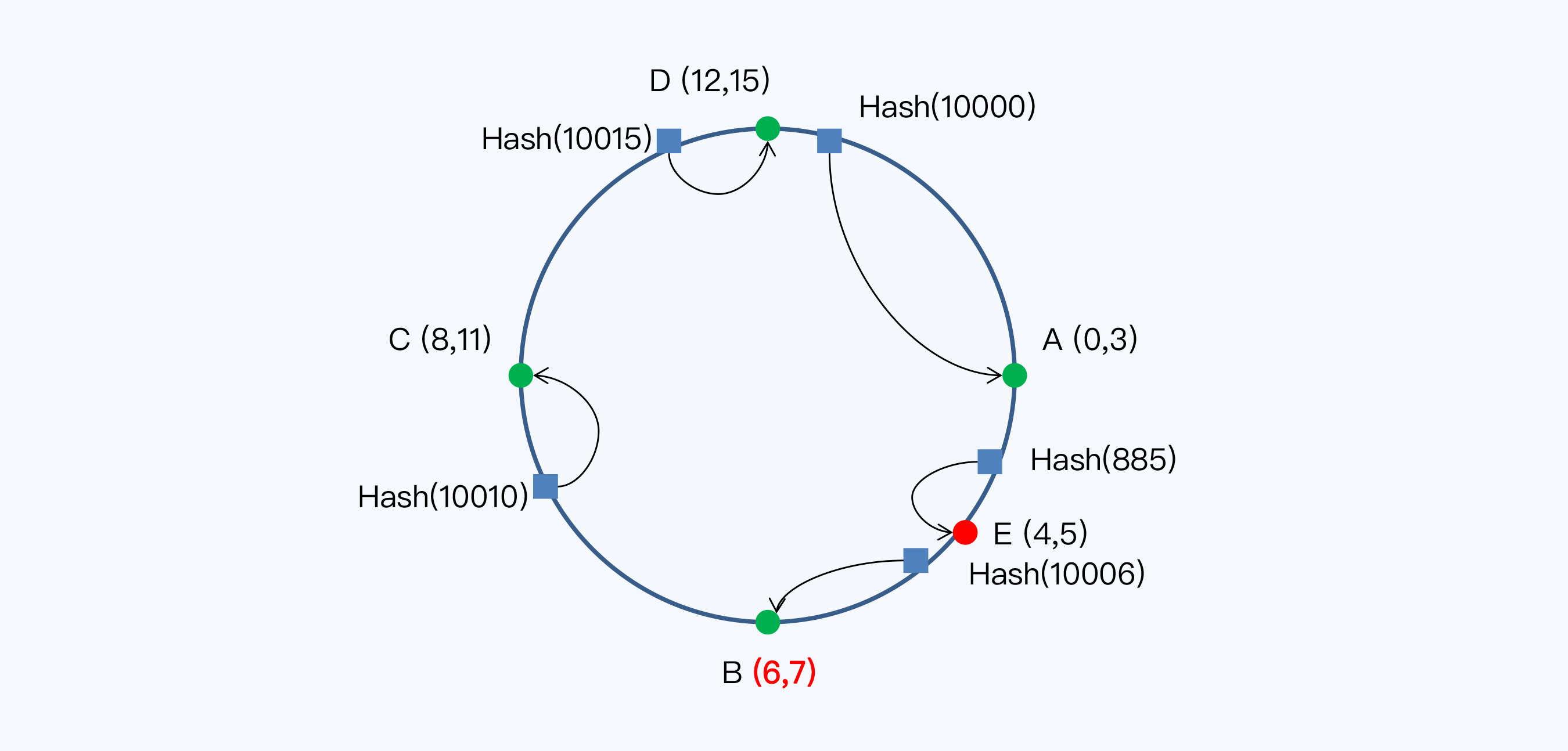 当我们新增一台服务器,即节点E时,受影响的数据仅仅是新服务器到其环空间中前一台服务器(即沿着逆时针方向的第一台服务器)之间数据。结合我们的示例,只有小红分享的消息从节点B被移动到节点E,其他节点的数据保持不变。此后,节点B只存储Hash值6和7的消息,节点E存储Hash值4和5的消息。