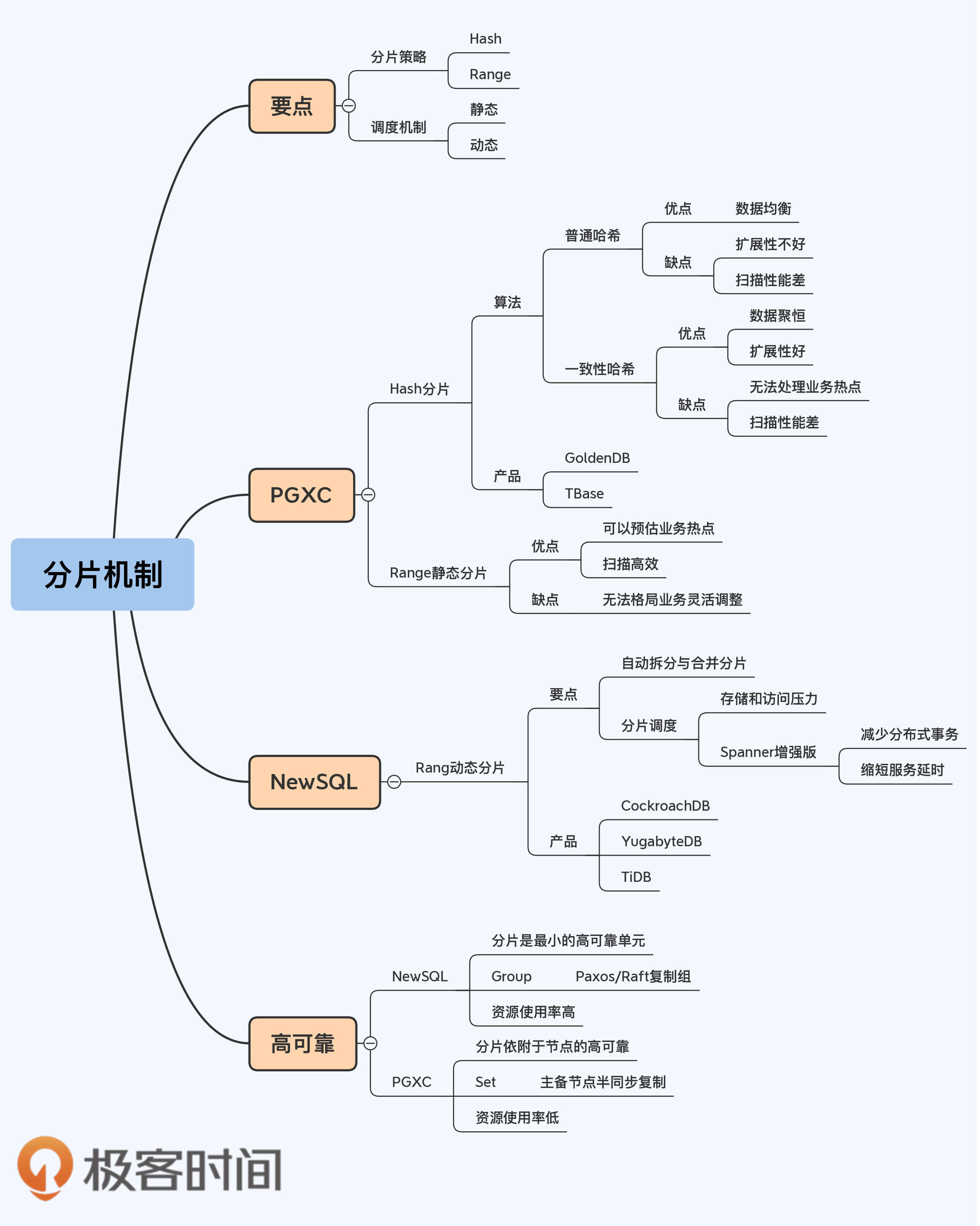到这里你应该已经大体了解了分布式数据库分片机制。我们说Range是更好的分片策略,就是因为Range分片有条件做到更好的动态调度,只有动态了,才能自适应各种业务场景下的数据变化,平衡存储、访问压力、分布式事务和访问链路延时等多方面的诉求。从我个人的观点来说,NewSQL的Range分片方式更加优雅,随着单体数据库底层数据同步机制的改进,未来PGXC可能也会向这种方式靠拢。