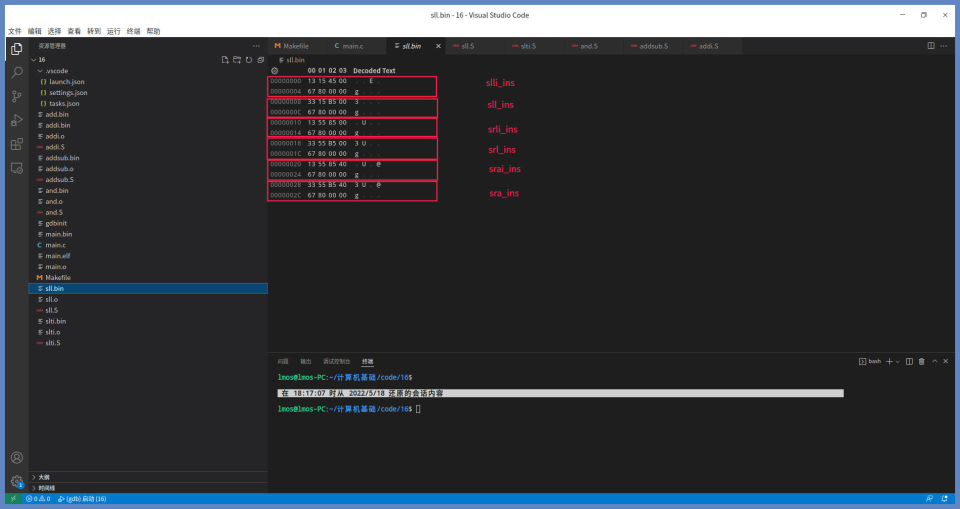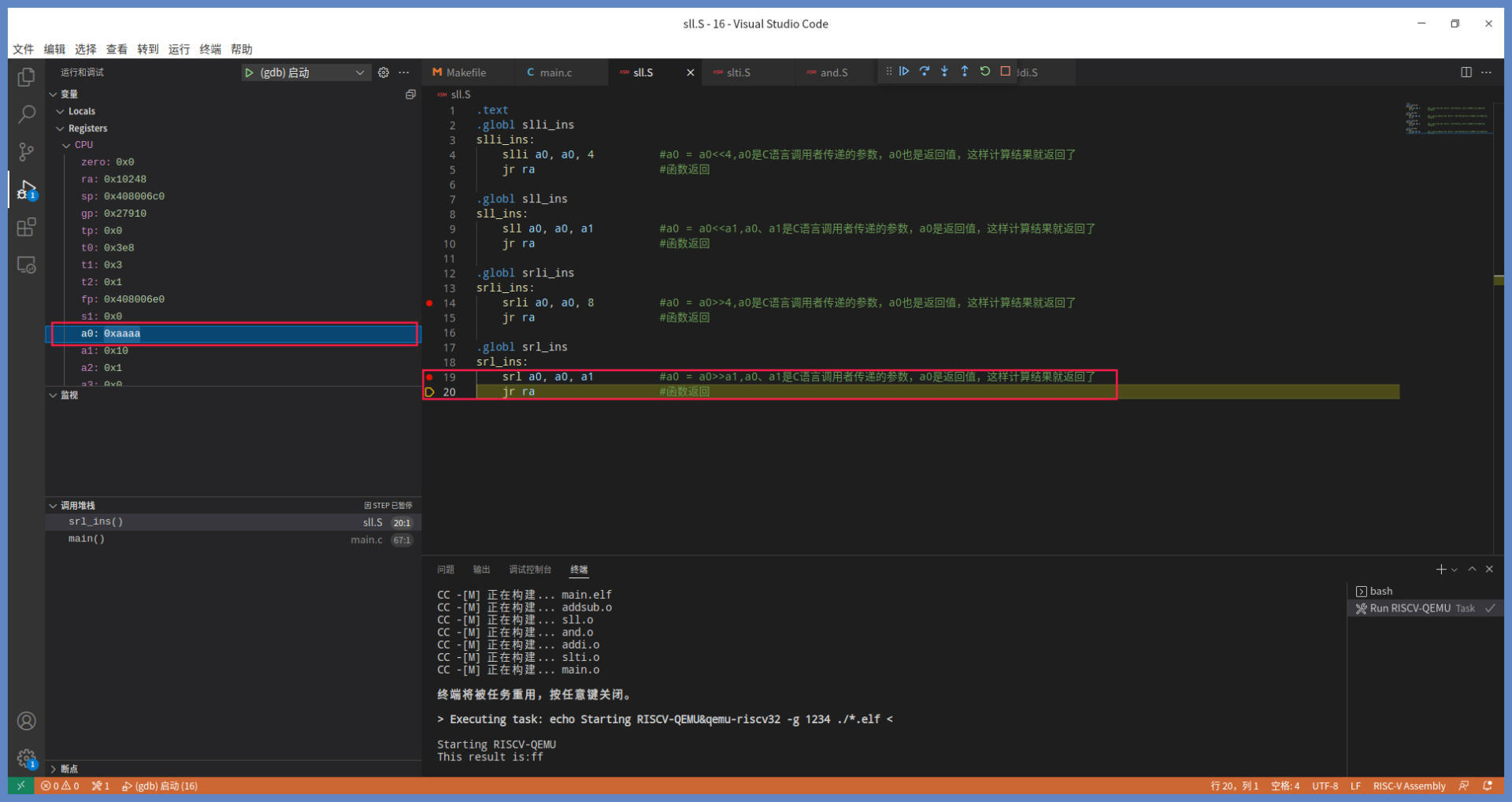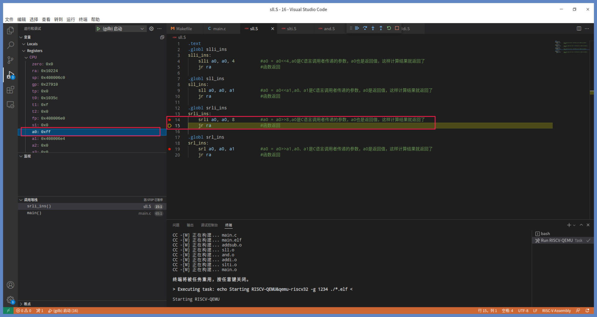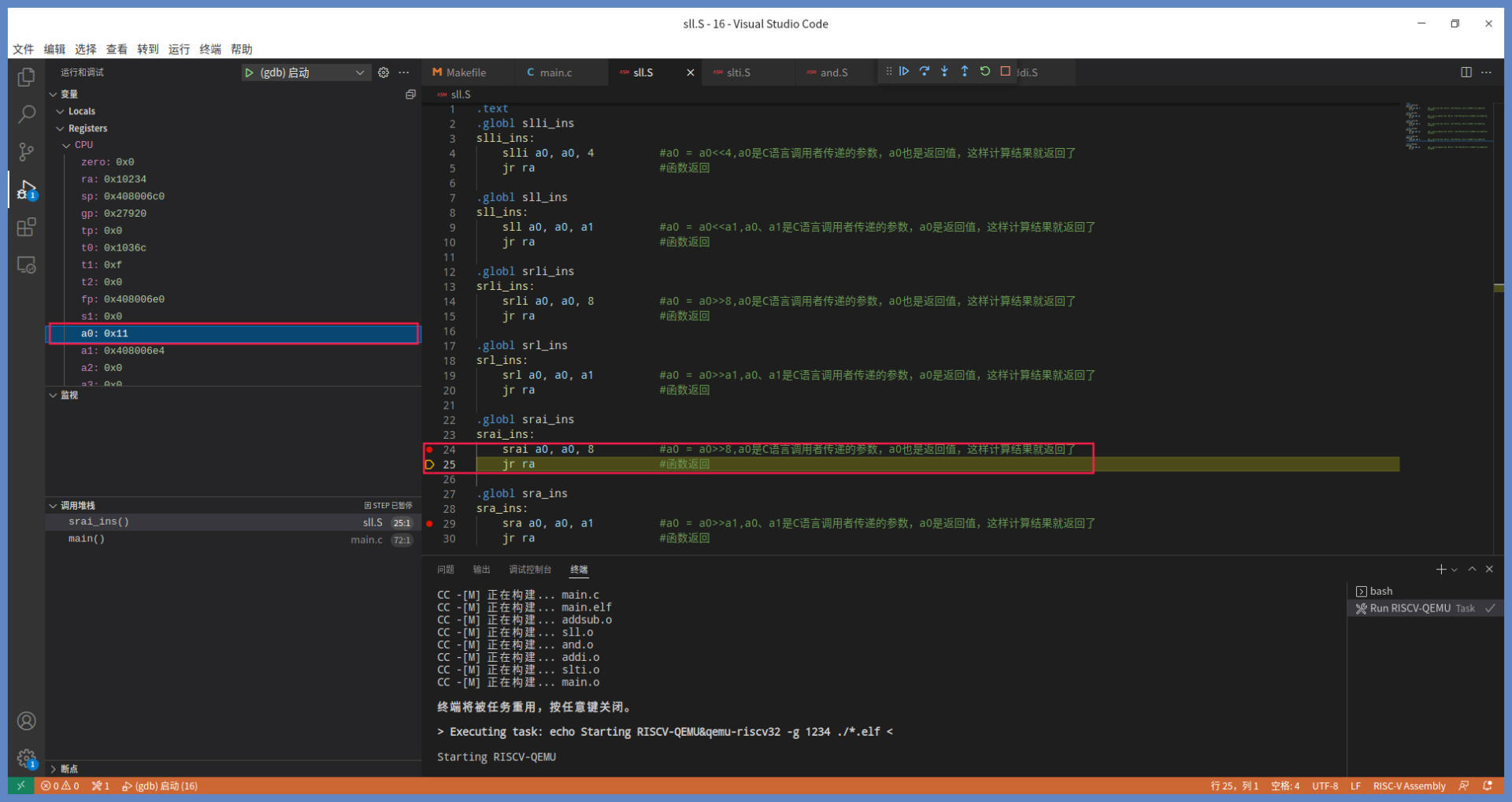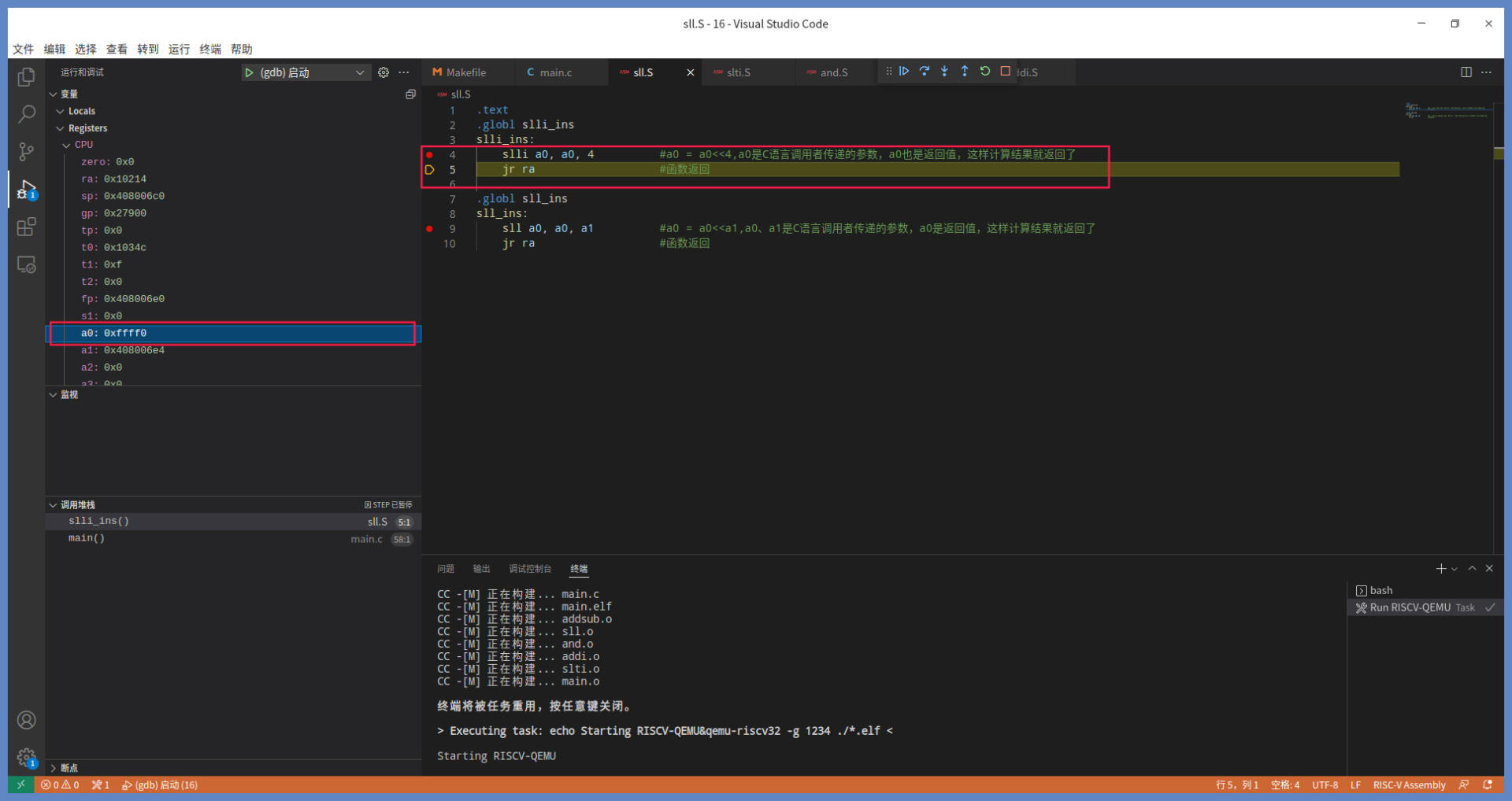 这里已经写好了slli_ins与sll_ins函数,它们会分别执行slli和sll指令。立即数逻辑左移slli指令是把a0中的数据左移4位。而逻辑左移sll指令是把a0中的数据左移,左移多少位要取决于a1中的数据,完成移动后再把结果写入到a0寄存器。
