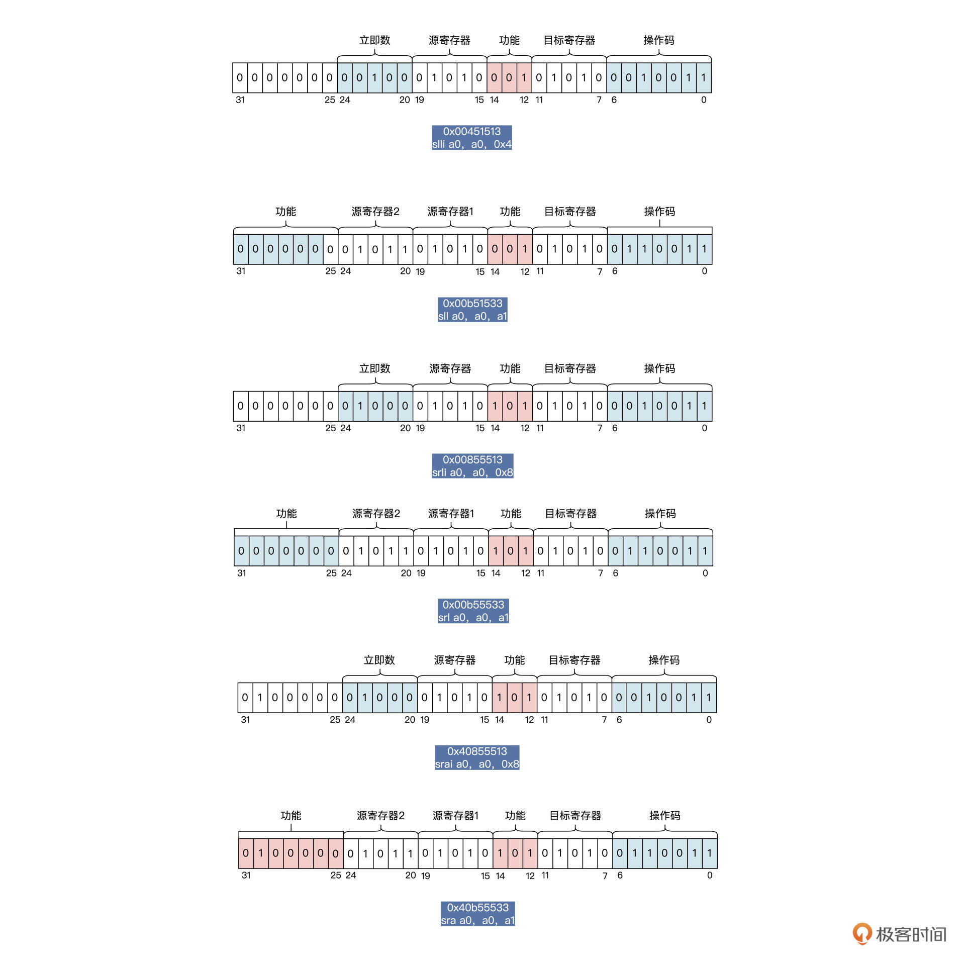 我们拆分一下slli、sll、srli、srl、srai、sra指令的各位段的数据,看看它们是在内存中如何编码的,你可以结合示意图来理解。