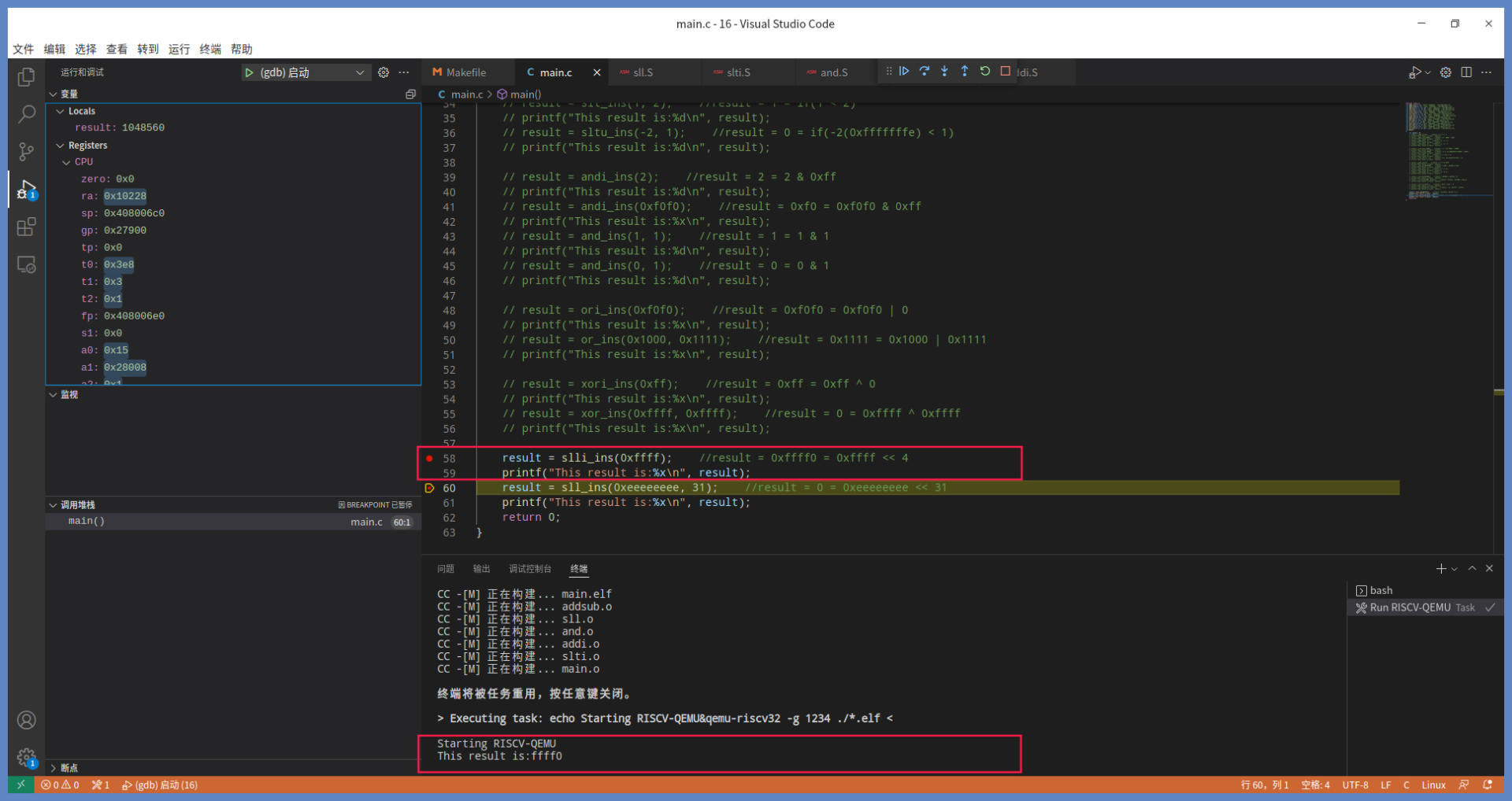 上图中是进入slli_ins函数,执行完slli a0,a0,4指令之后,执行jr ra指令之前的状态,我们给slli_ins函数传进来的参数是0xffff。现在对照图示就能看到,a0寄存器中的值确实已经变成0xffff0了,这说明运算结果是正确的。