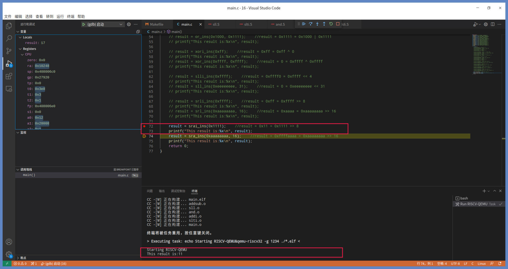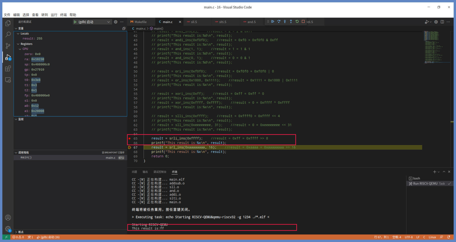 上图中是进入srli_ins函数,执行完srli a0,a0,8指令之后,执行jr ra指令之前的状态,我们给srli_ins函数传进来的参数是0xffff。现在,对照截图可以看到a0寄存器中的值确实已经变成0xff了,这说明运算结果正确。