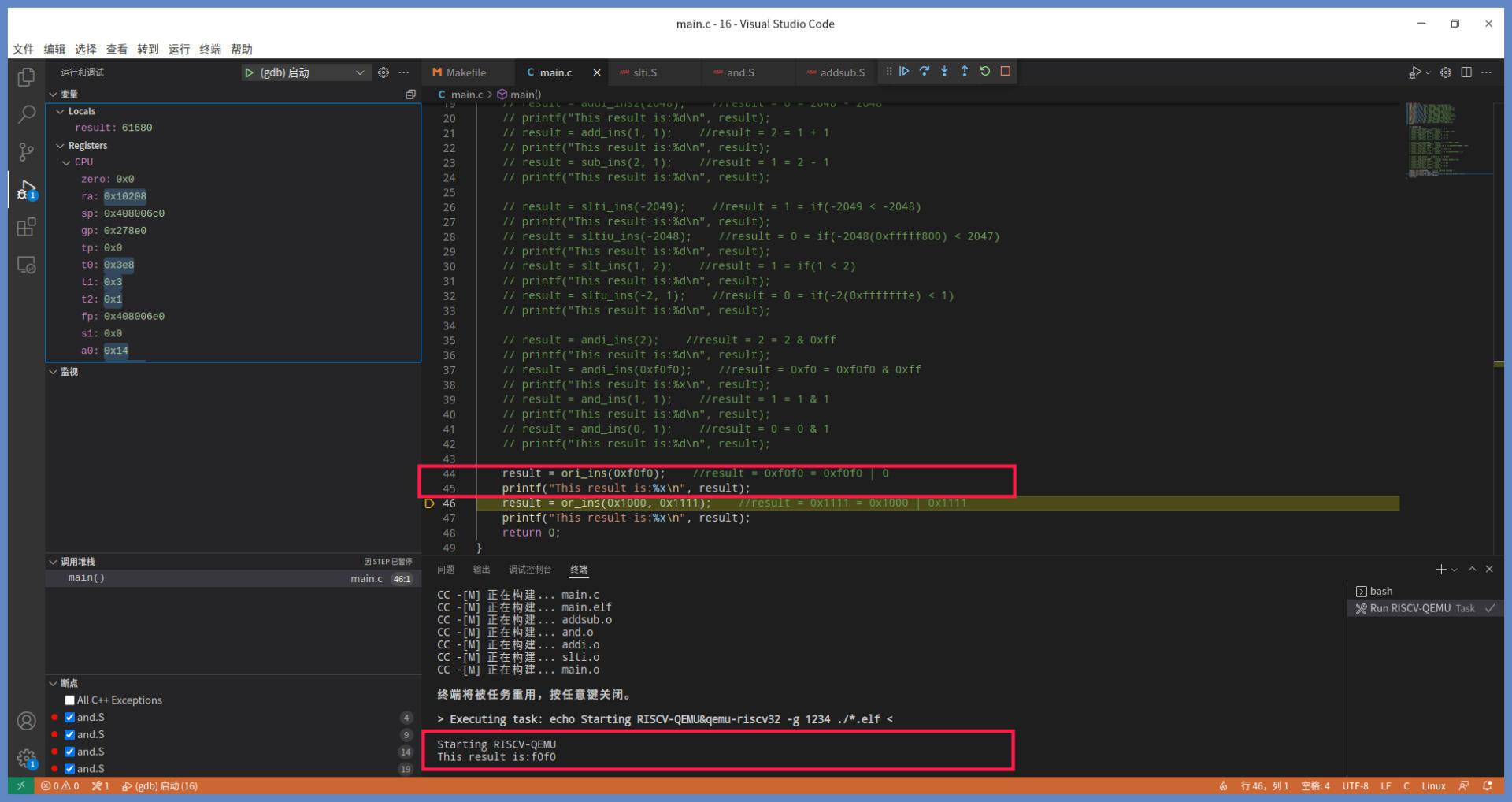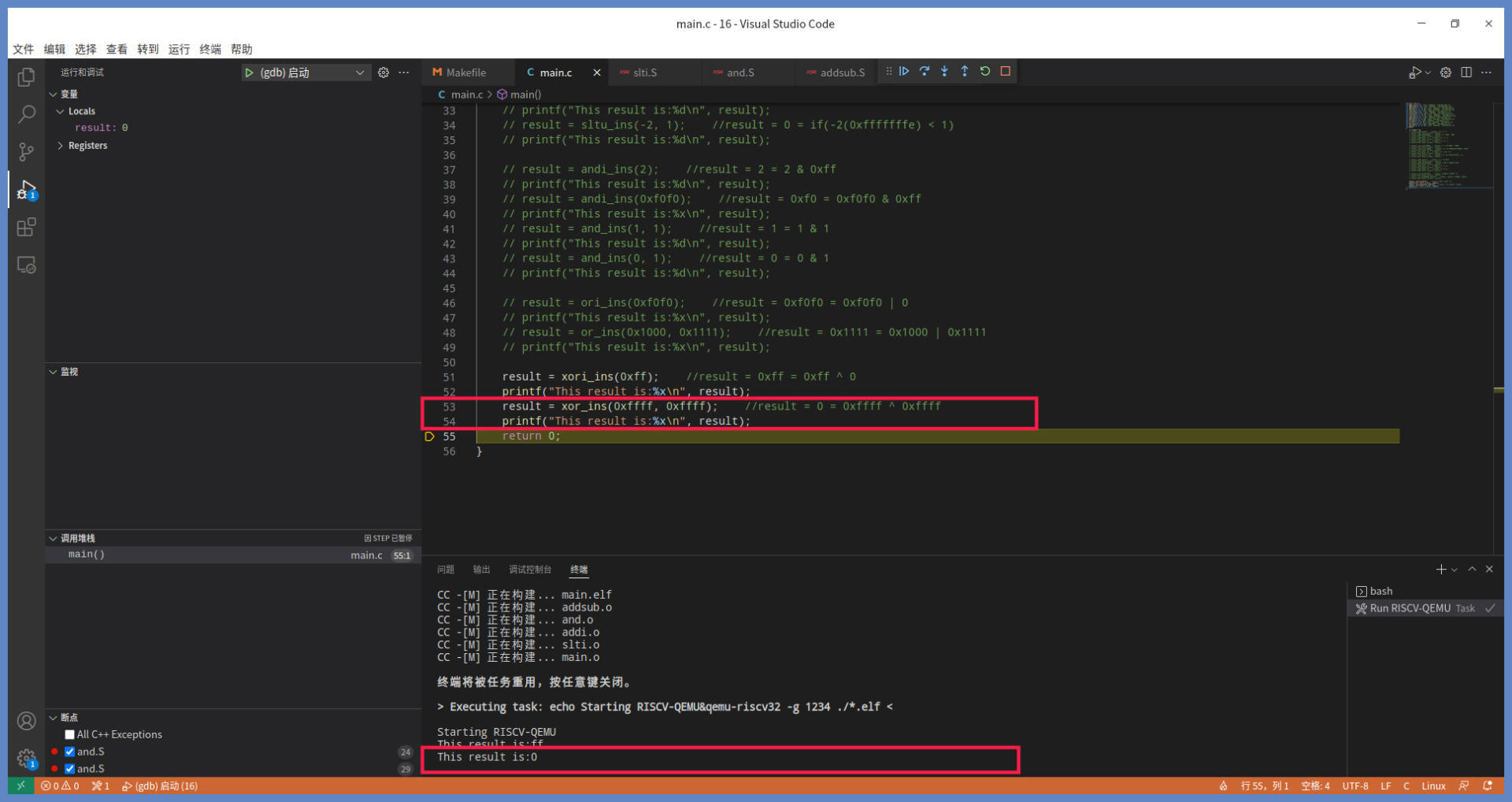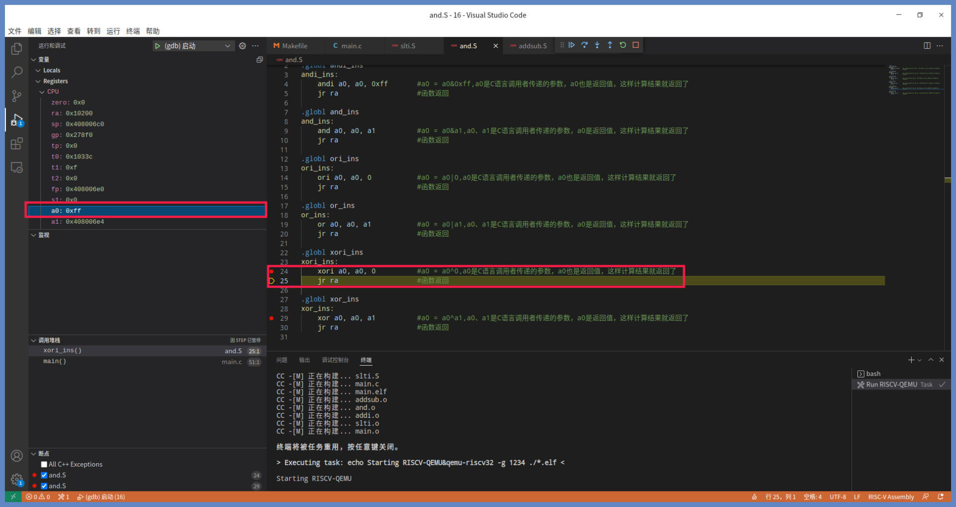 我们看到a0寄存器中的值已经变成0了,这说明运算的结果正确,符合预期。