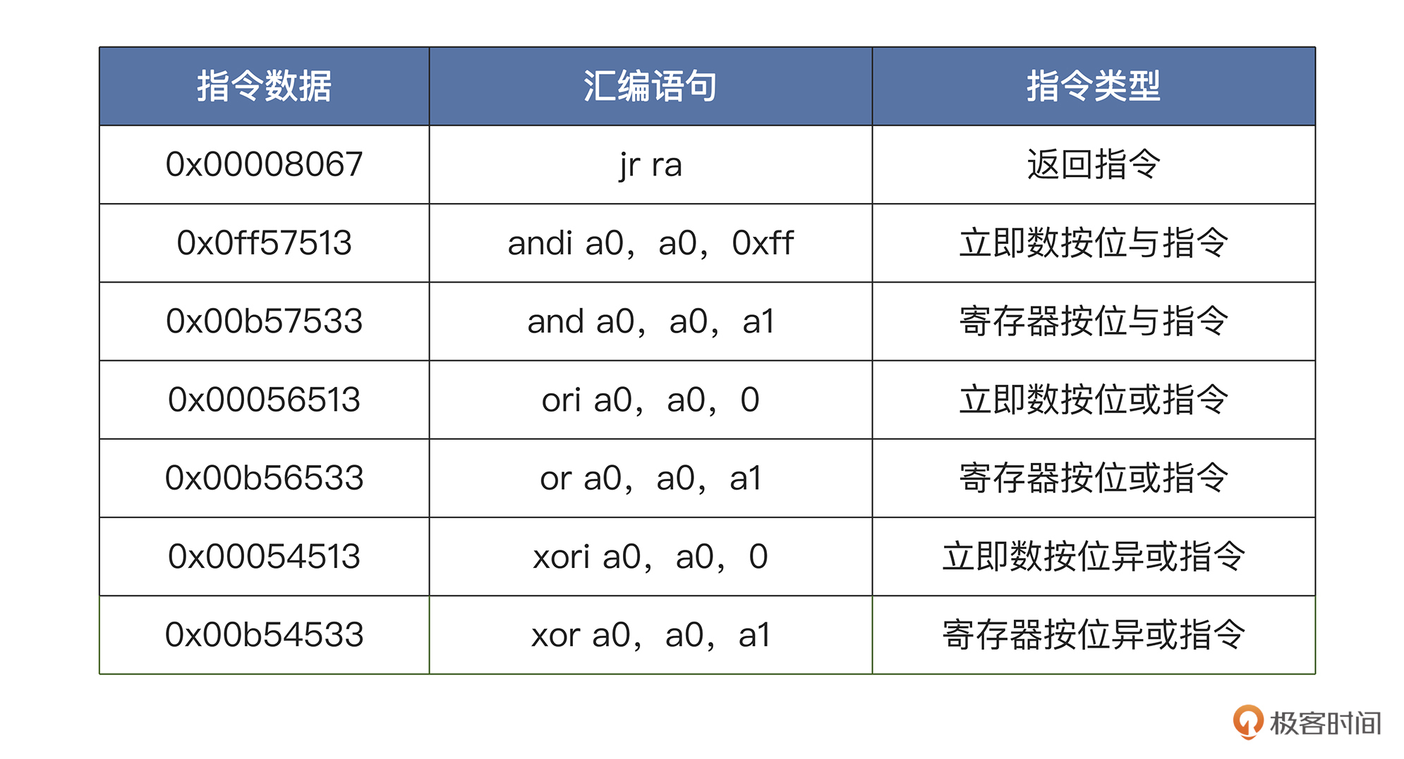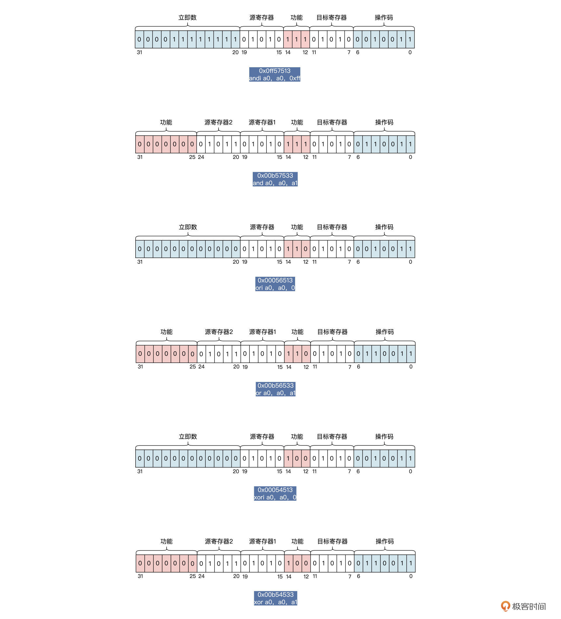 同样地,我带你拆分一下andi、and、ori、or、xori、xor指令的各位段的数据,看看它们是如何编码的。