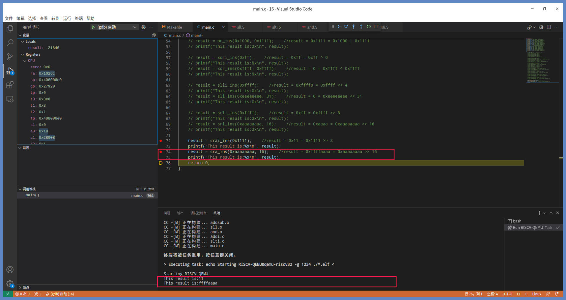 因为我们给算术右移函数sra_ins的参数是0xaaaaaaaa和16,这表明对0xaaaaaaaa算术右移16,0xaaaaaaaa的二进制数据是(0b10101010101010101010101010101010),注意其符号位为1,所以算术右移16位后的结果是0xffffaaaa,它的二进制数据是(0b11111111111111111010101010101010),结果是符合预期的。输出的结果也证实了这一点。