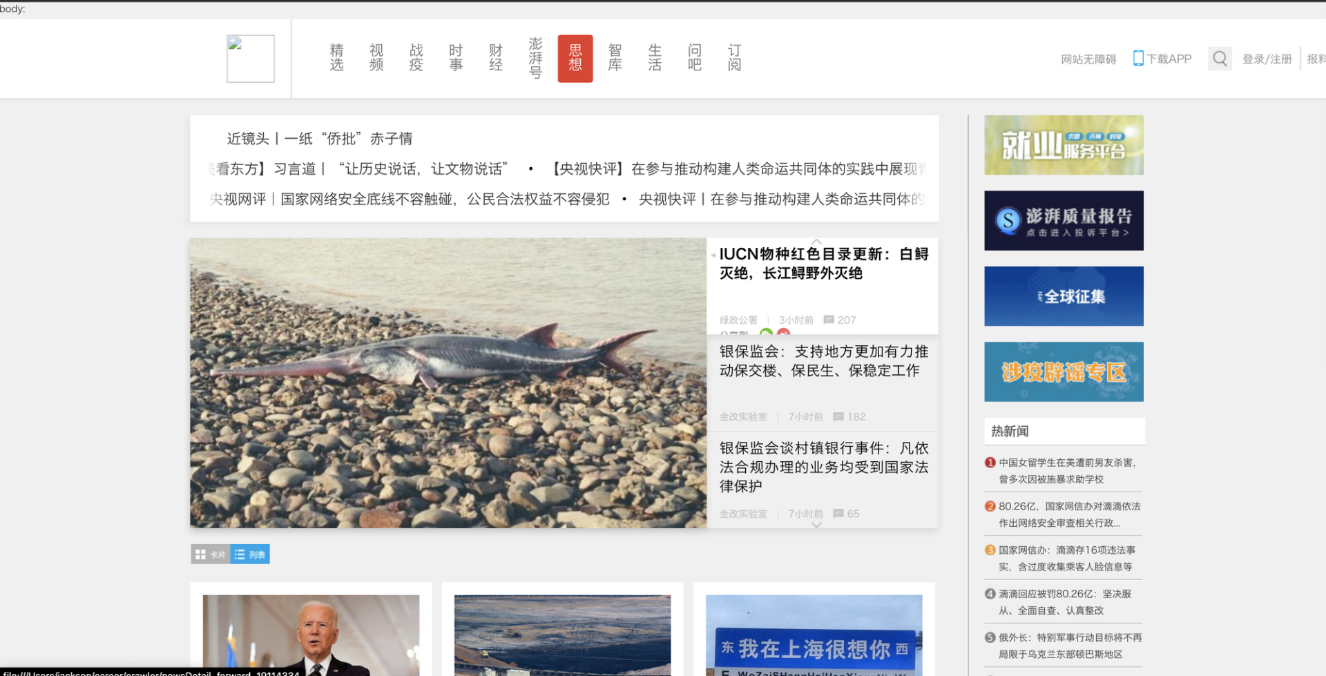 假设我们希望获取一些最新的新闻资讯,但是我们却不可能时刻守在电脑旁刷新网页,这就是爬虫大显身手的地方了。我们以知名的澎湃新闻为例,获取其首页的新闻内容。