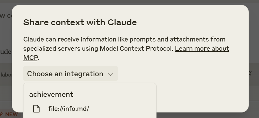 这样,mcp 命令行就会自动帮我们把 Claude Desktop 的 MCP Server 的配置文件修改好。然后我们启动 Claude Desktop,点击图中红框位置插座的标识,就可以看到 file://info.md 这条资源。