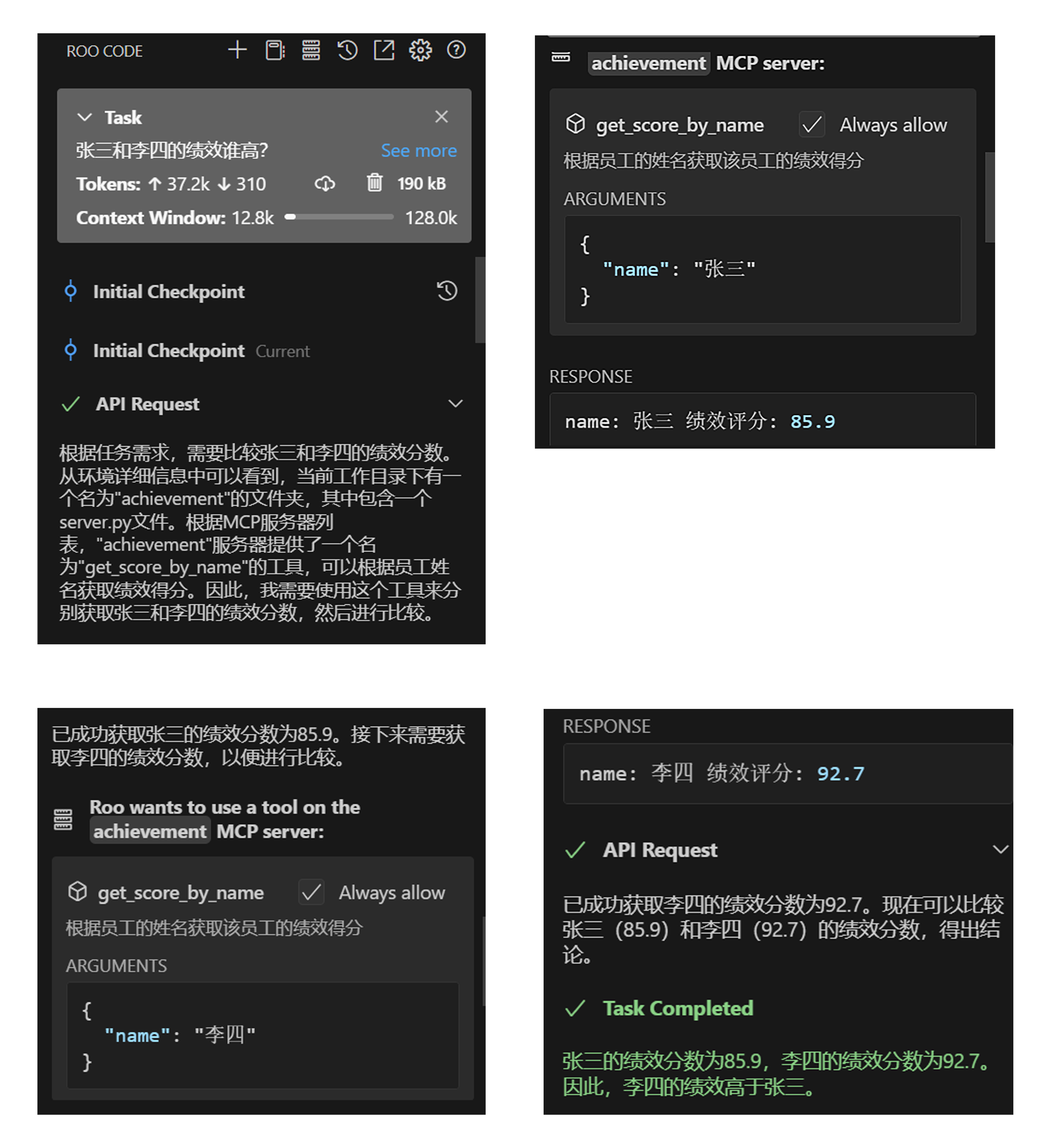 然后我们就可以测试了,提问“张三和李四的绩效谁高?”