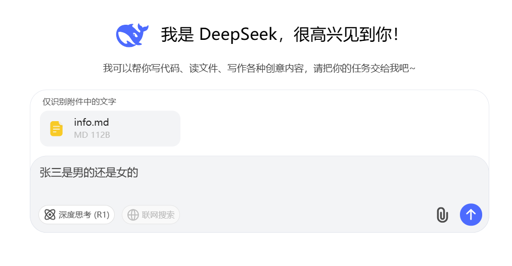 大家如果用过 ChatGPT、Kimi,DeepSeek 的文件对话功能,可能会觉得以上的 Resource 功能非常熟悉。比如,我用 DeepSeek 做演示: