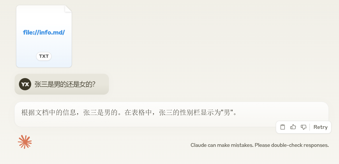 此时可以看到,对话界面就包含了这条资源。然后我们询问“张三是男的还是女的”,就可以得到正确的回答了。