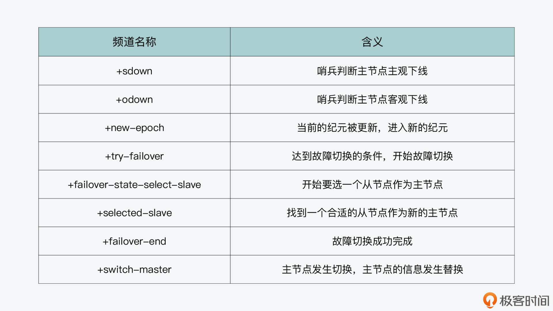 其实,在哨兵的工作过程中,如果有客户端想要了解故障切换的整体情况或进度,比如主节点是否被判断为主观下线、主节点是否被判断为客观下线、Leader是否完成选举、新主节点是否切换完成,等等,就可以通过subscribe命令,订阅上面这张表中的相应频道。这样一来,客户端就可以了解故障切换的过程了。