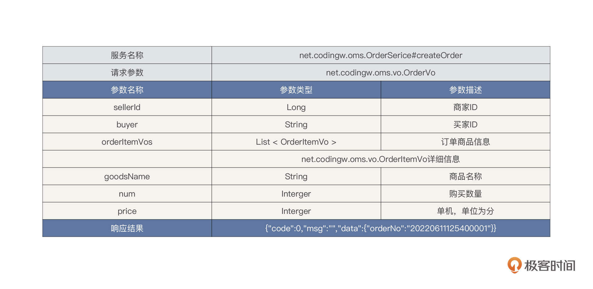 物流公司内部已经基于Dubbo构建了订单中心微服务域,其中创建订单接口的定义如下: