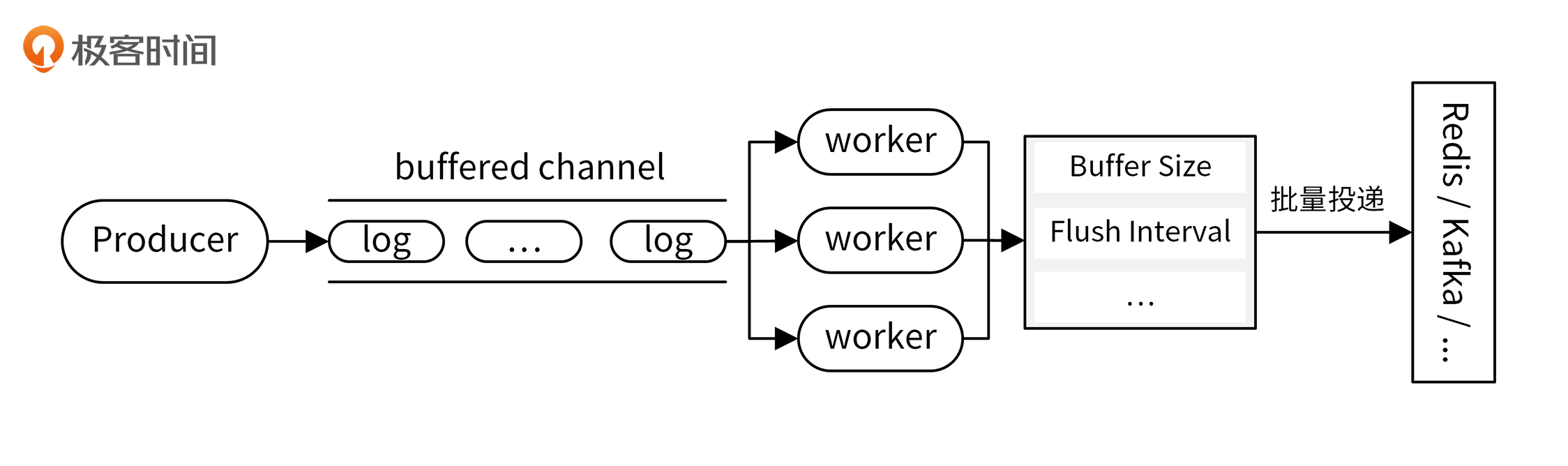Producer将数据投递到带缓冲的channel中,后端有多个worker消费channel中的数据,并进行批量投递。你可以设置批量投递的条件,一般至少包含最大投递日志数和最大投递时间间隔这两个。
