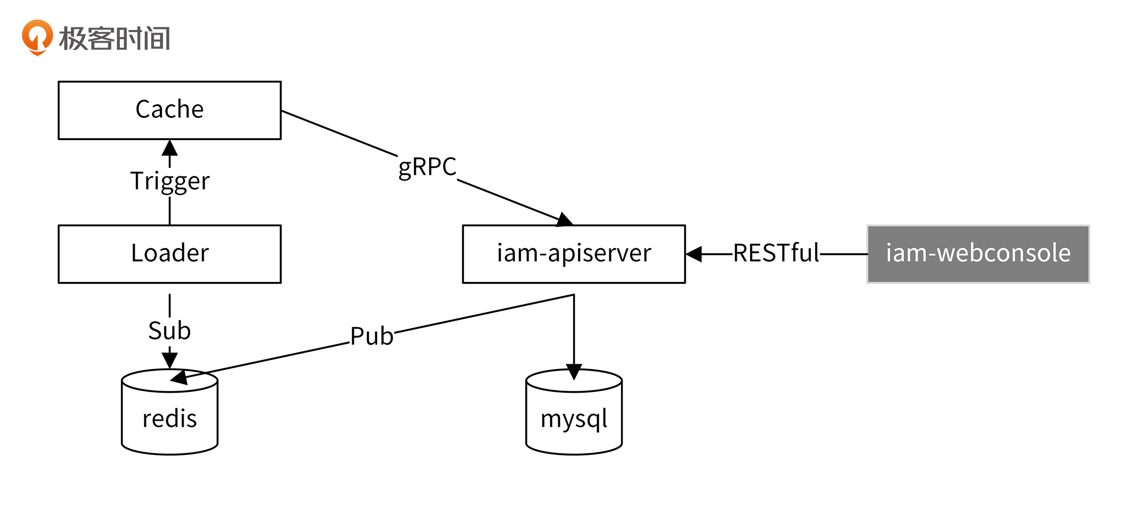 上面介绍了 iam-authz-server的 /v1/authz 接口,为了最大化地提高性能,采用了大量的缓存设计。因为数据会分别在持久化存储和内存中都存储一份,就可能会出现数据不一致的情况。所以,我们也要确保缓存中的数据和数据库中的数据是一致的。数据一致性架构如下图所示:
