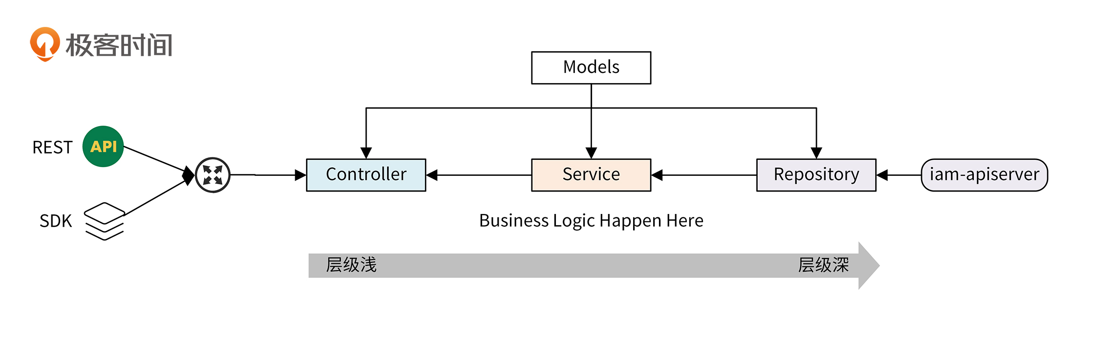 iam-authz-server的代码架构也分为4层,分别是模型层(Models)、控制层(Controller)、业务层 (Service)和仓库层(Repository)。从控制层、业务层到仓库层,从左到右层级依次加深。模型层独立于其他层,可供其他层引用。如下图所示: