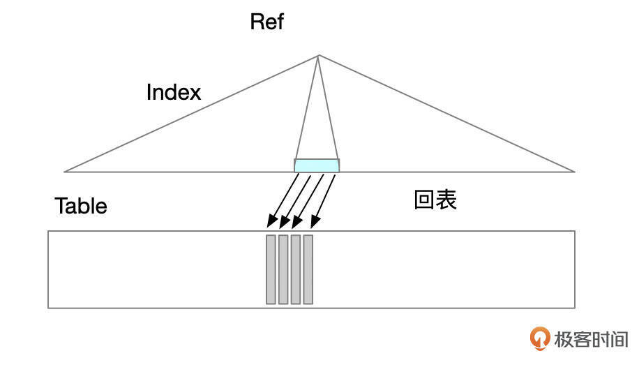 先在索引中定位到第1条满足索引查找条件的记录。 如果语句没有使用覆盖索引,还需要回表获取整条记录。 判断记录是否满足查询语句中的其它条件。如果满足条件,则返回记录。 在索引中获取下一行记录。 下面是REF访问路径的一个例子: