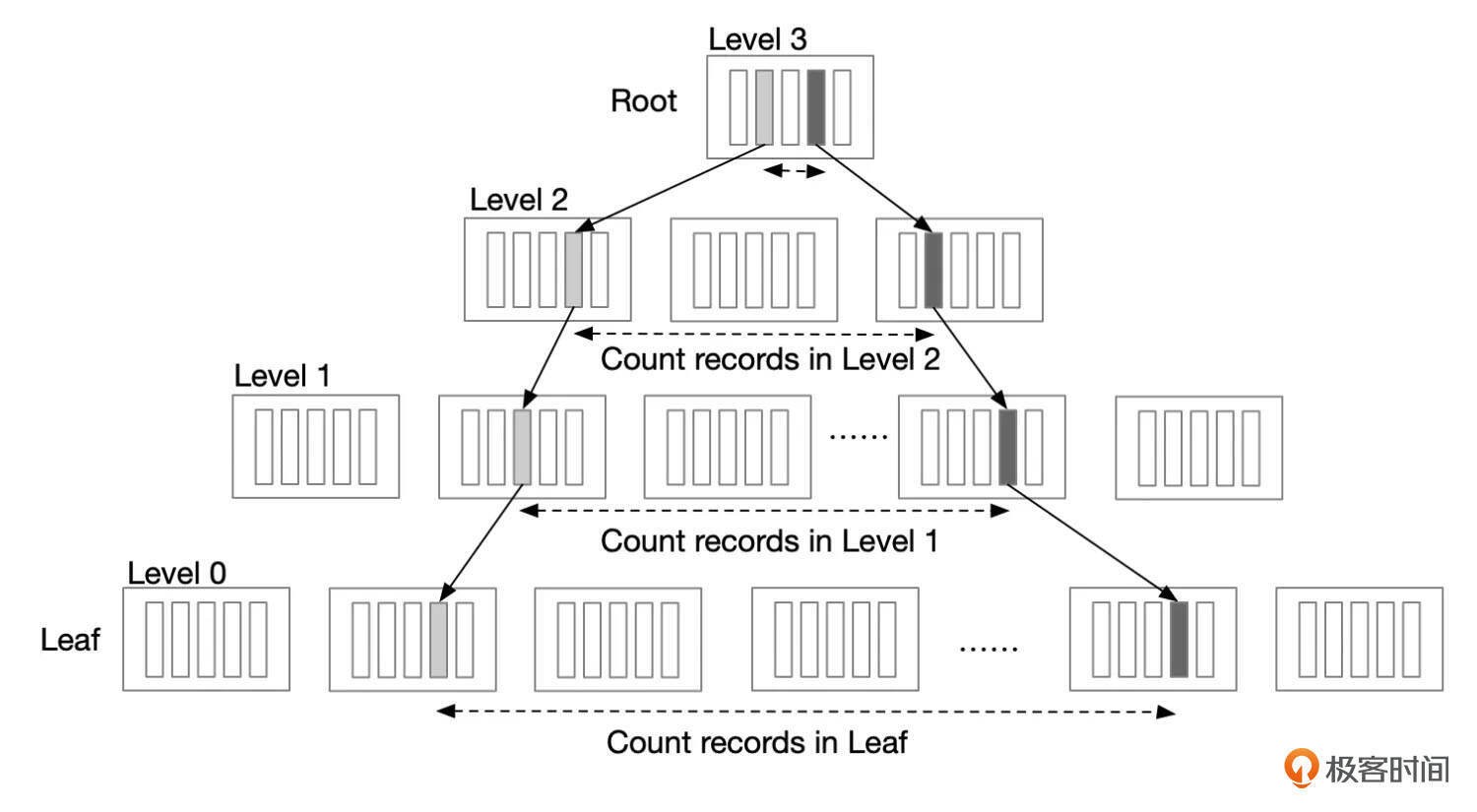 Index Dive是怎么工作的? 上一讲中提到了,InnoDB使用了Index Dive机制,来评估一个索引区间内有多少行记录。那么Index Dive是如何估算一个索引区间内的记录数呢?大致的步骤是这样的。