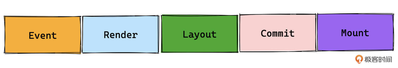 一般而言,在 React Native 中,一个渲染任务可分为5个子任务。比如,先处理点击手势(Event),接着执行 React Render 函数,之后 Yoga 引擎开始计算布局(Layout),再然后框架提交(Commit)为渲染而准备的 “React Shadow Tree”,最后将挂载(Mount)“React Shadow Tree”,并在屏幕上显示。示意图如下:
