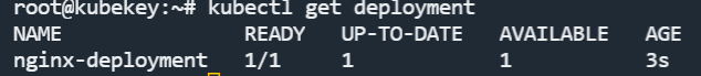 可以看到 READY 下面写着 1/1,这表示期望副本数是 1,实际创建成功的副本数也是 1。之后我们再用如下命令查看一下 pod 状态:
