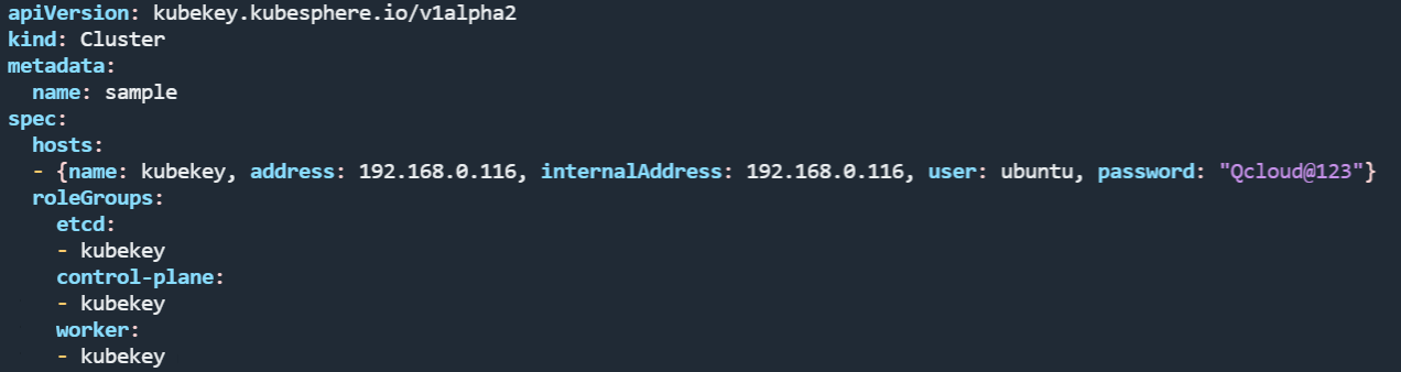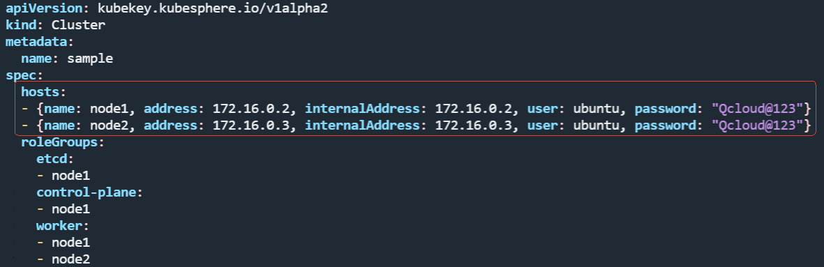 之后还要修改 roleGroups 下的信息,这表示 etcd、control-plane(master),以及 worker 装在哪个节点,我们统一改成 hostname。改完后的样式如下: