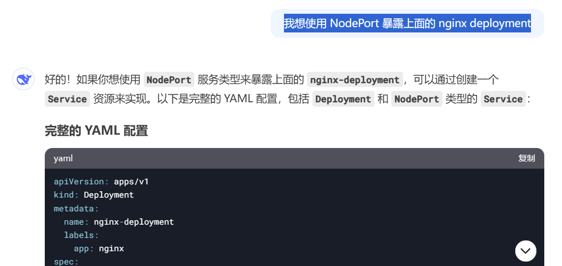 我们用 NodePort 进行暴露,还是让 DeepSeek 帮我们完成。提示词: