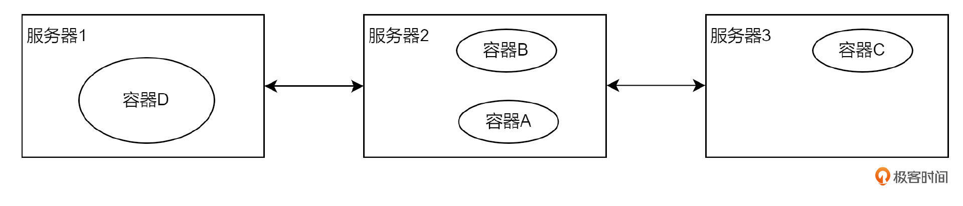 假设有一天,我想运行一个特别消耗 CPU、内存资源的容器 D。但三台服务器上都有应用占用资源,导致容器 D 无法运行。此时的解决方案就是,把容器 A 迁移到服务器 2 上去,给容器 D 腾地方。