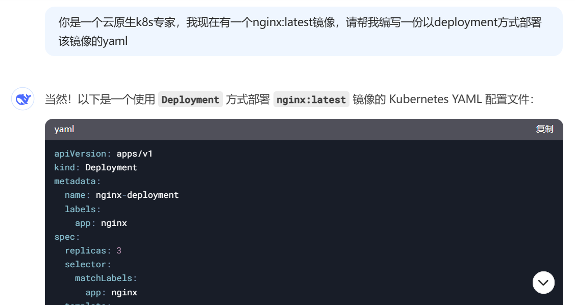 K8s 创建资源(pod 等)的方式是编写一个 YAML 文件,可以理解为一个如何创建资源的描述文件。之后使用 kubectl 命令行进行创建。我们可以让 DeepSeek 帮我生成一个 YAML,然后理解一下每个字段是什么意思即可,没必要去死记硬背。提示词如下: