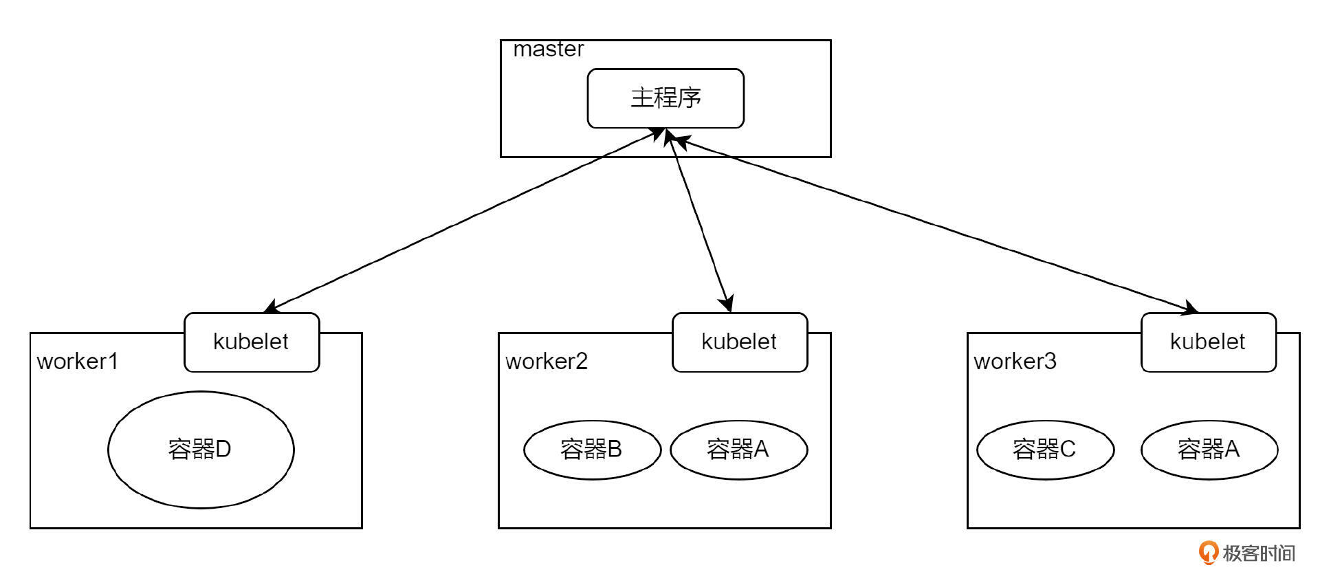 那这些服务器之间是如何关联的呢?这会有一个主程序进行统一的管理。通常主程序是单独部署到一台服务器上的,也就是所谓的 master 节点,剩余的跑容器应用的服务器叫做 worker 节点。在 worker 节点上会安装一个客户端程序,学名叫 kubelet,主程序不能直接和容器应用建立联系,而是通过与 kubelet 建立联系来实现对容器应用的编排等操作。因此图就变成了这样: