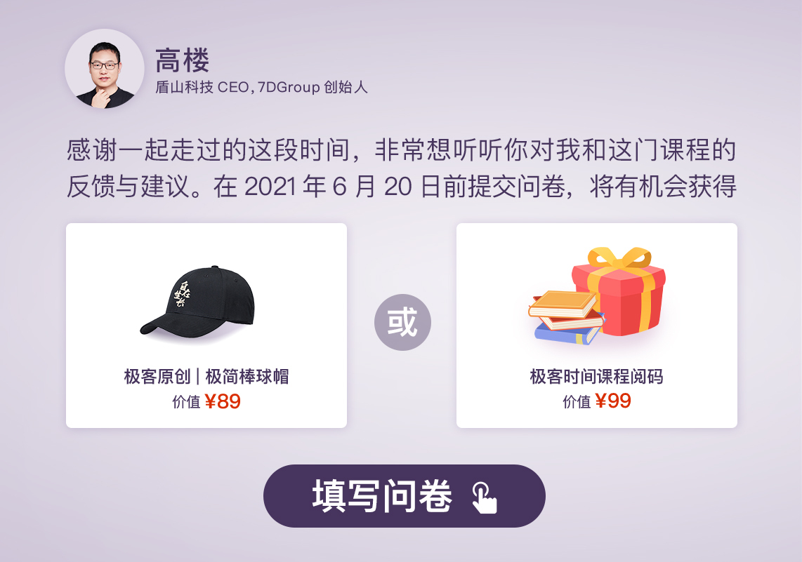 在课程的最后,我为你准备了一份结课问卷,希望你能花 1 分钟时间填写一下,我想听一听你对这门课的反馈。只要填写,就有机会获得一顶极简棒球帽或者是 价值 99 元的课程阅码。期待你的畅所欲言。