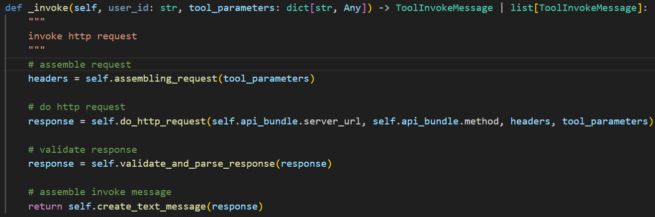 进入 api -> core -> tools -> tool 目录,有一个 api_tool.py 文件。它定义了一个 _invoke 方法,就是通用 HTTP 工具。代码如下: