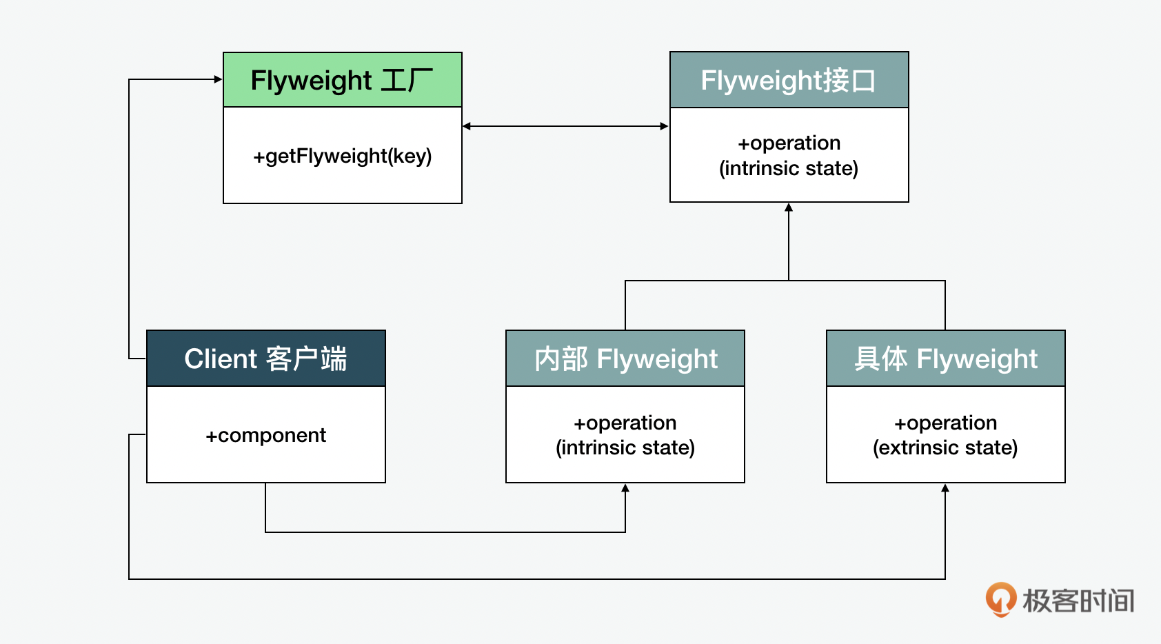 享元接口(flyweight interface)可以接收和作用于外部状态。具体享元(concrete flyweight)是接口的实际实现,它负责存储可分享的内在状态,并且可以控制外部状态。享元工厂(flyweight factory)负责管理和创建享元对象。在客户端发起对享元对像的请求时,如果对象已经存在,就返回对象;如果尚未存在,则创建一个相关对象。
