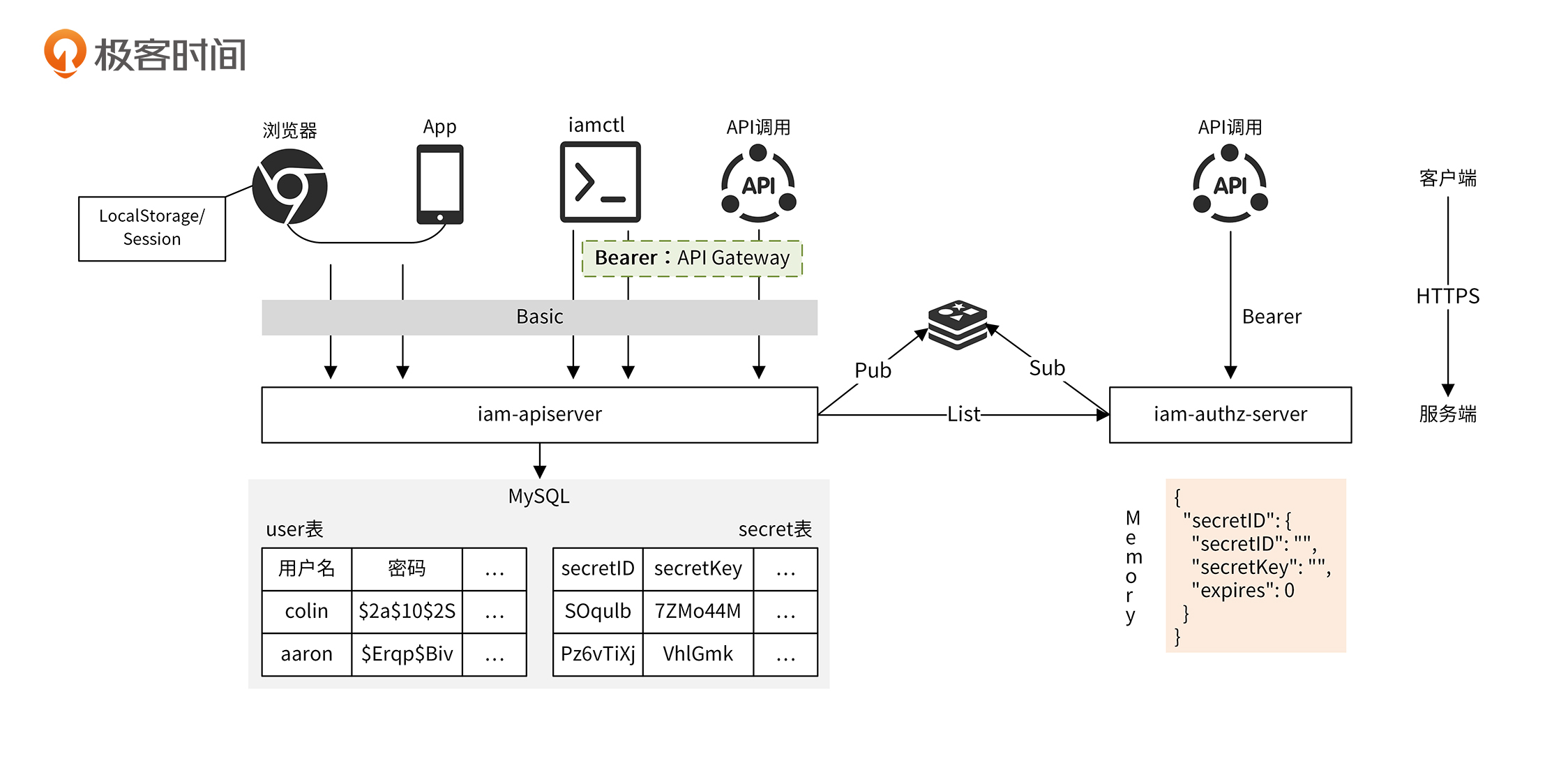 控制台、App端需要登录系统,所以需要使用用户名:密码这种认证方式,也即Basic认证。iamctl、API调用、Go SDK因为可以不用登录系统,所以可以采用更安全的认证方式:Bearer认证。同时,Basic认证作为iam-apiserver已经集成的认证方式,仍然可以供iamctl、API调用、Go SDK使用。