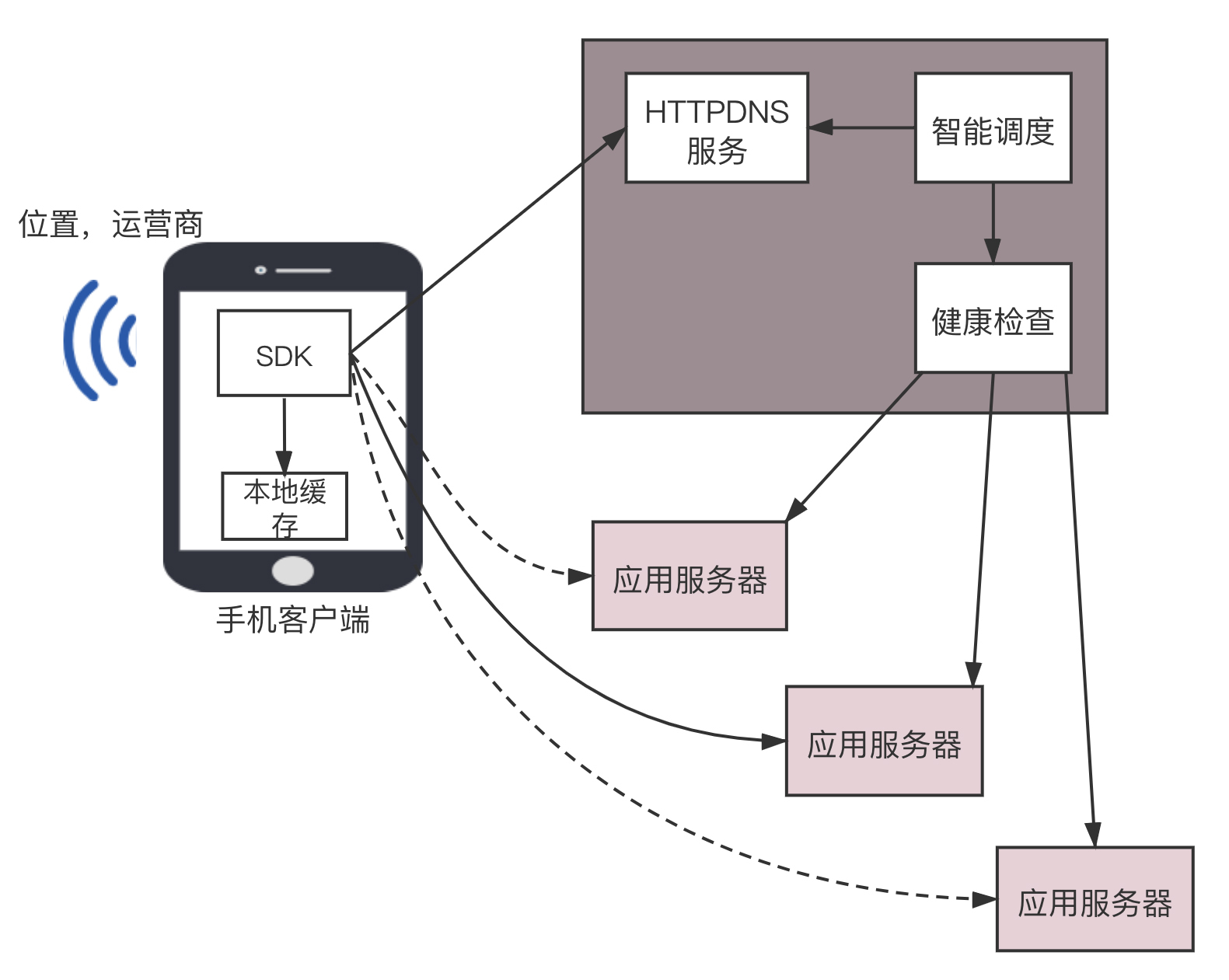 - HttpDNS通过客户端SDK和服务端,通过HTTP直接调用解析DNS的方式,绕过了传统DNS的这些缺点,实现了智能的调度。