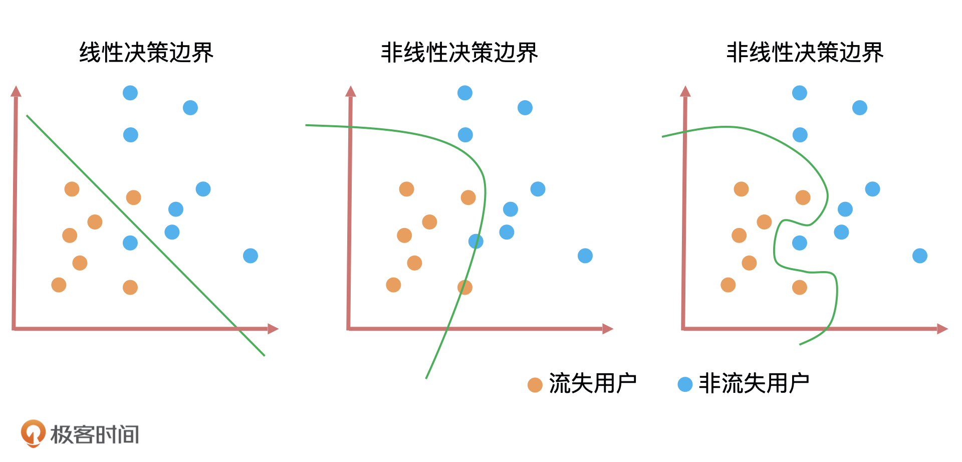 具体到我们这个流失用户预测的例子上,模型训练的目的就是找到一个平衡点,让模型绘制出的决策边界,能够最大地区分流失用户和非流失用户,也就是预测流失用户的准确率最高,并且还兼顾了模型的稳定性。
