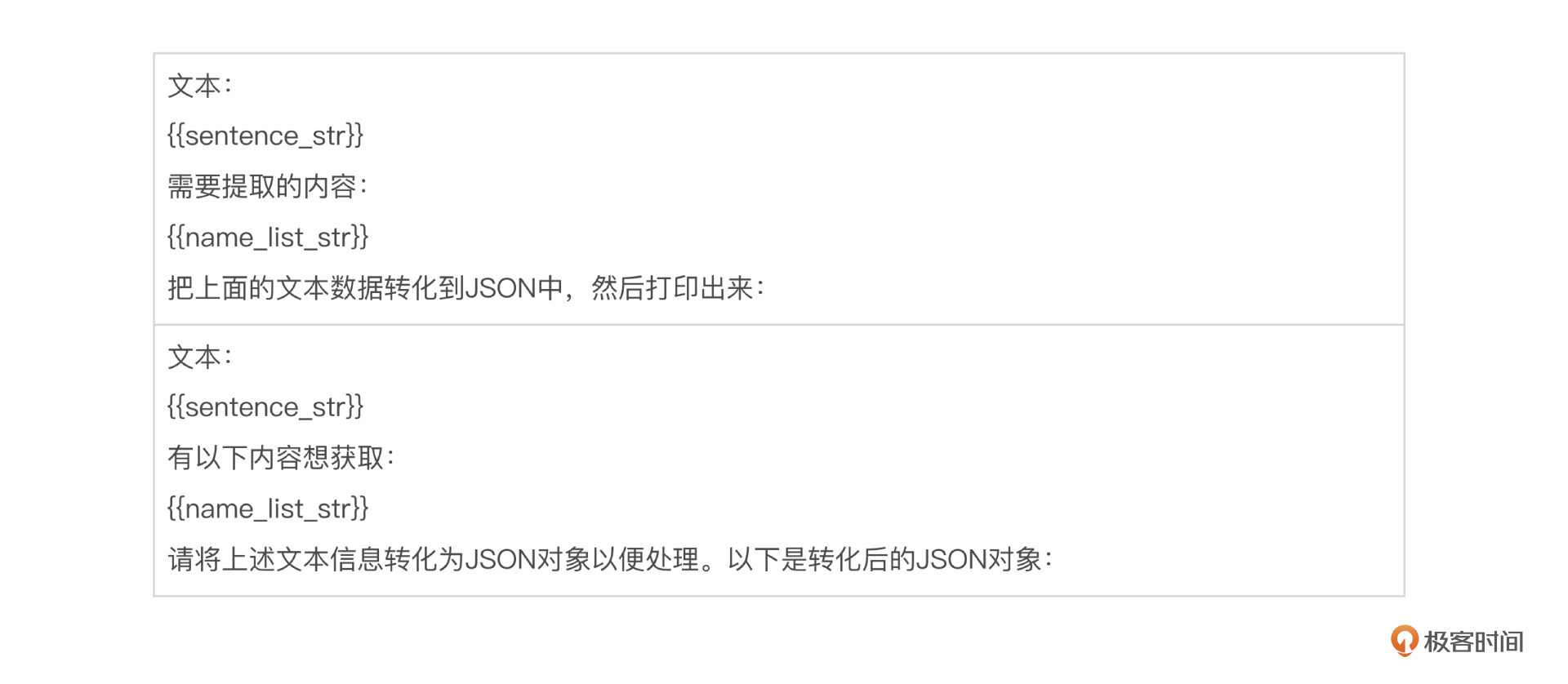我们继续拆分例子里的 {{sentence_str}} 部分,我先针对具体场景把可变的部分做成模版变量,从例子出发,你会更好理解一些。