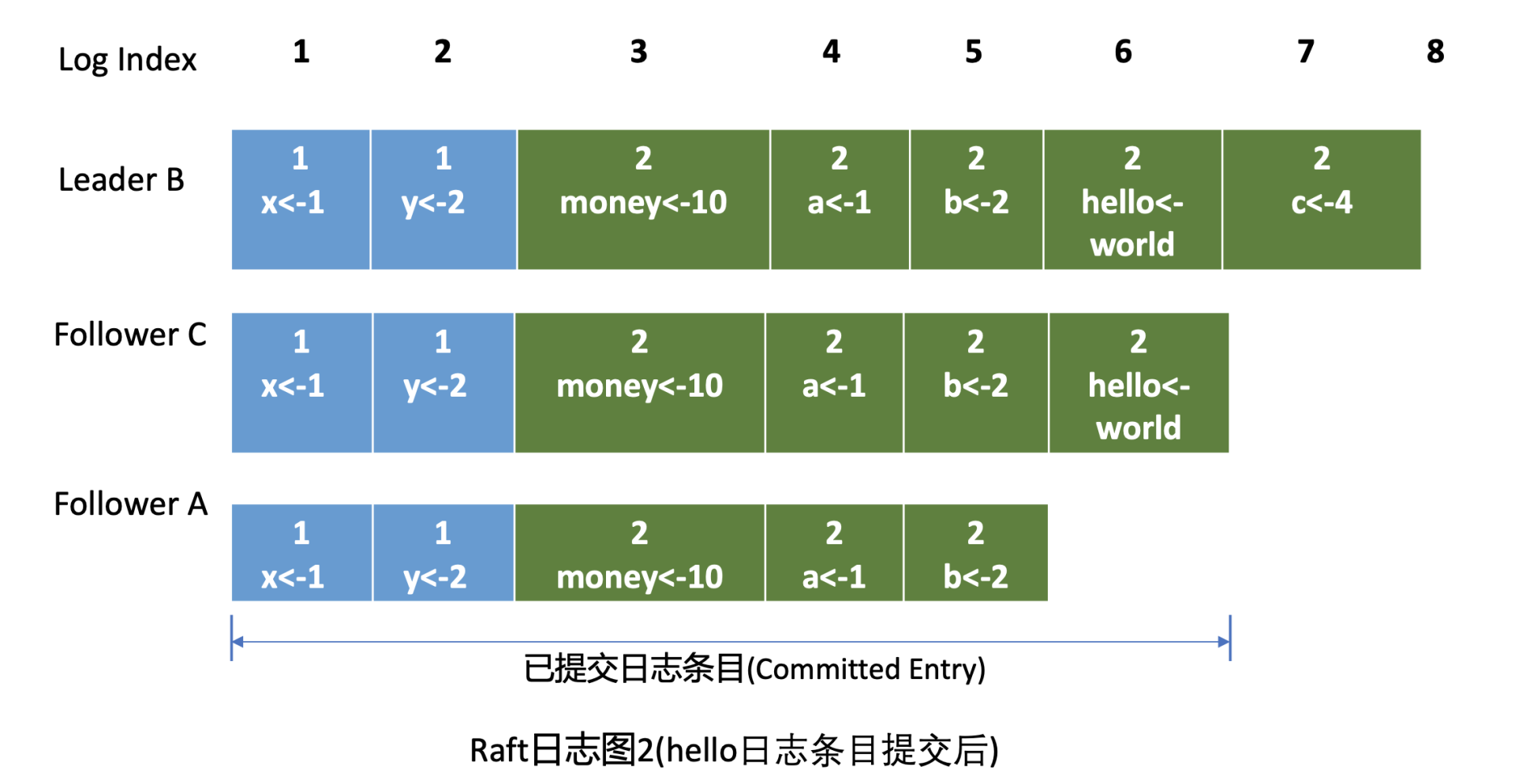日志图1描述的是hello日志条目未提交前的各节点Raft日志状态。