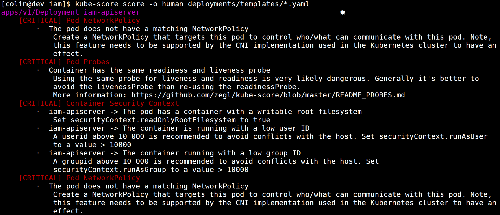 1 $ kube-score score -o human deployments/iam.invalid.yaml