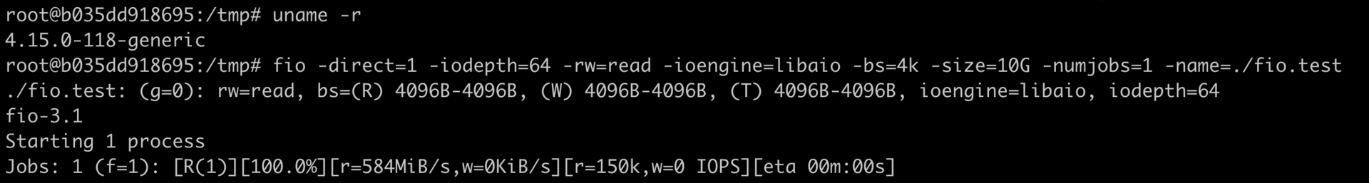 那我们看到在ubuntu 18.04,内核4.15上的容器I/O性能是584MB/s的带宽,IOPS(I/O per second)是150K左右。