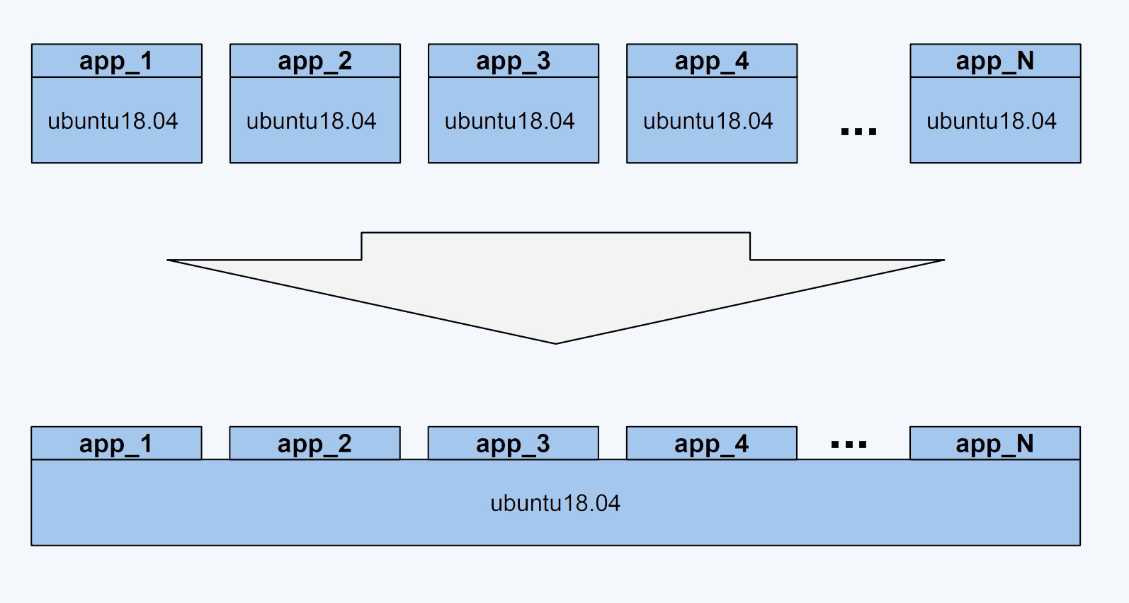 没错,当然是在一个宿主机上只要下载并且存储存一份”ubuntu:18.04”,所有基于”ubuntu:18.04”镜像的容器都可以共享这一份通用的部分。这样设置的话,不同容器启动的时候,只需要下载自己独特的程序部分就可以。就像下面这张图展示的这样。
